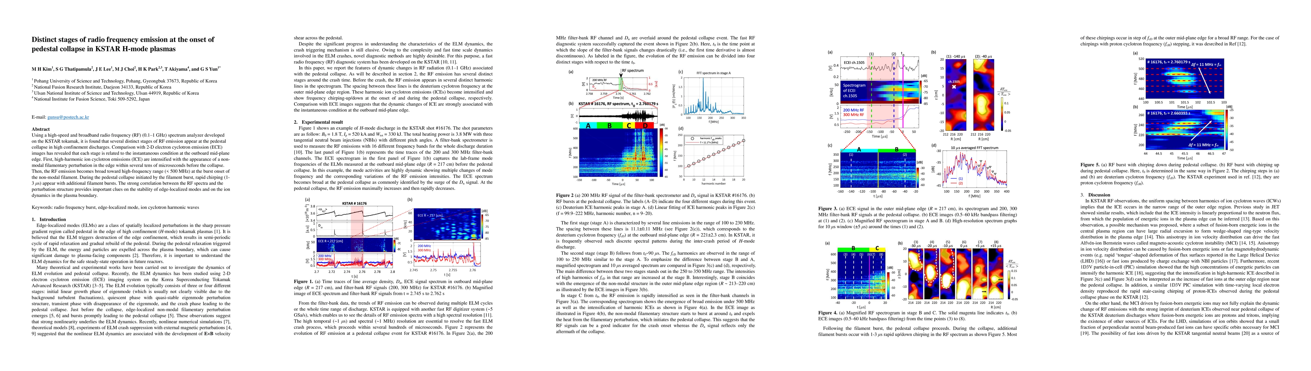 This paper identifies distinct stages of radio frequency emission during pedestal collapse in KSTAR H-mode plasmas, using a high-speed RF spectrum analyzer. The stages correlate with the edge plasma conditions, revealing the dynamics of edge-localized modes and ion behavior in the plasma boundary.