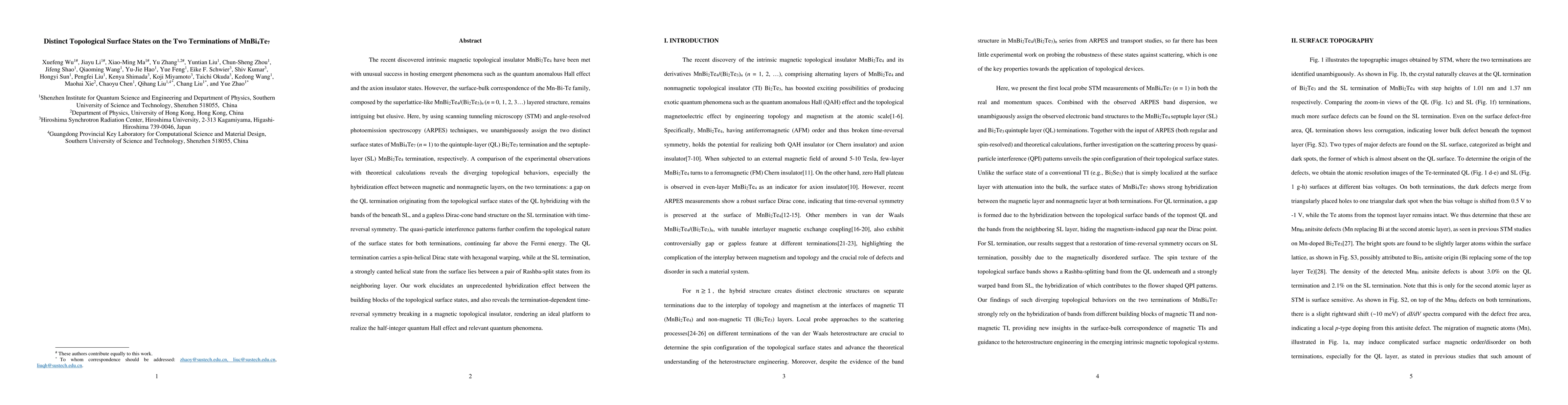 Researchers used STM and ARPES to identify two distinct surface states on MnBi4Te7, attributed to the Bi2Te3 and MnBi2Te4 terminations, revealing hybridization effects and termination-dependent time-reversal symmetry breaking in a magnetic topological insulator.