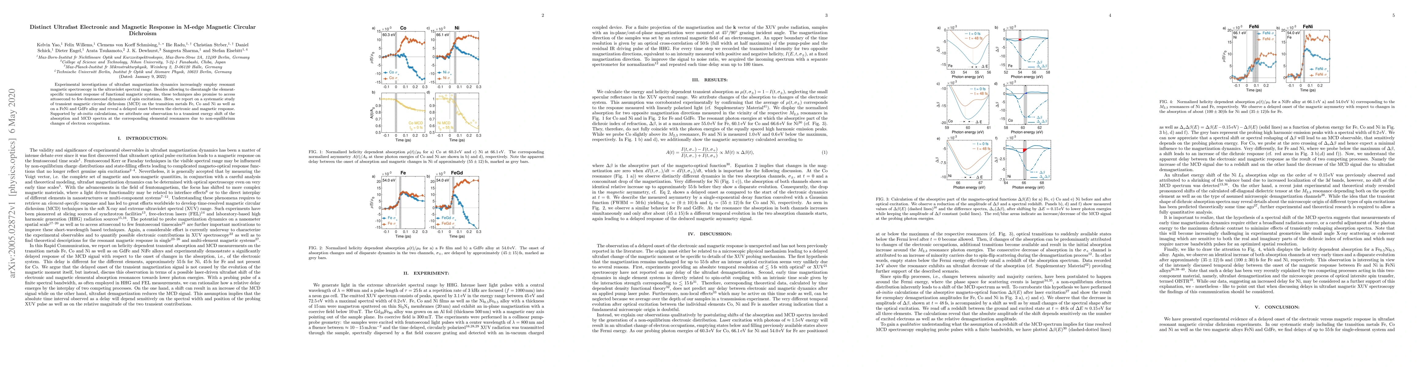 This paper investigates ultrafast magnetization dynamics using resonant magnetic spectroscopy in the ultraviolet range, focusing on transient magnetic circular dichroism (MCD) in transition metals and alloys. The study reveals a distinct delay between electronic and magnetic responses, attributed to transient energy shifts in absorption and MCD spectra due to non-equilibrium electron occupations, supported by \textit{ab-initio} calculations.