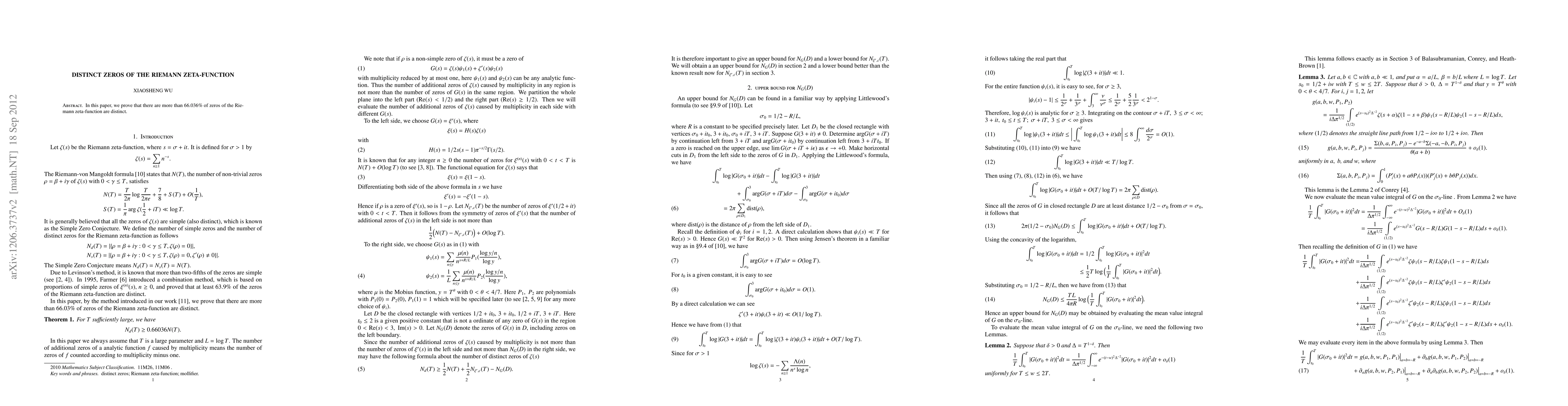 Summary: This paper demonstrates that over 66.036% of the zeros of the Riemann zeta-function are distinct, contributing significantly to the understanding of the distribution of these critical values. The findings enhance the knowledge surrounding the Riemann Hypothesis.