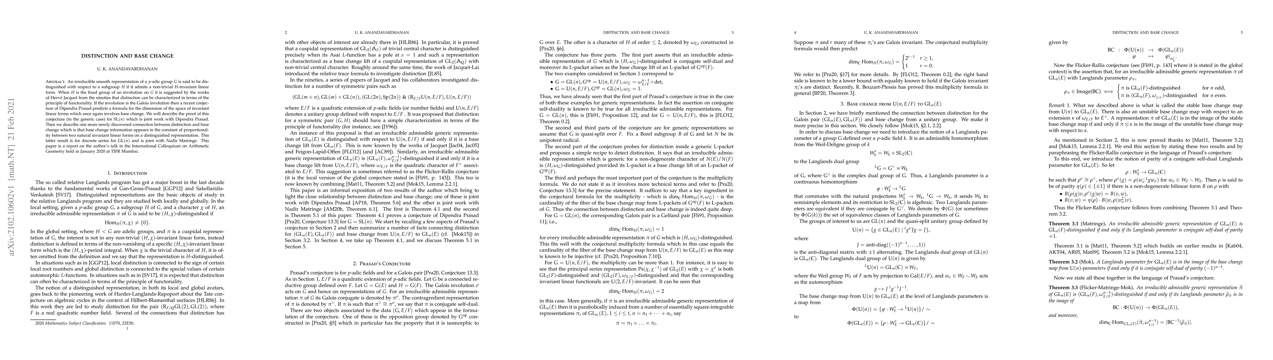 An irreducible smooth representation of a $p$-adic group $G$ is said to be distinguished with respect to a subgroup $H$ if it admits a non-trivial $H$-invariant linear form. When $H$ is the fixed group of an involution on $G$ it is suggested by the works of Herv\'e Jacquet from the nineties that distinction can be characterized in terms of the principle of functoriality. If the involution is the Galois involution then a recent conjecture of Dipendra Prasad predicts a formula for the dimension of the space of invariant linear forms which once again involves base change. We will describe the proof of this conjecture (in the generic case) for $SL(n)$ which is joint work with Dipendra Prasad. Then we describe one more newly discovered connection between distinction and base change which is that base change information appears in the constant of proportionality between two natural invariant linear forms on a distinguished representation. This latter result is for discrete series for $GL(n)$ and is joint with Nadir Matringe. This paper is a report on the author's talk in the International Colloquium on Arithmetic Geometry held in January 2020 at TIFR Mumbai.