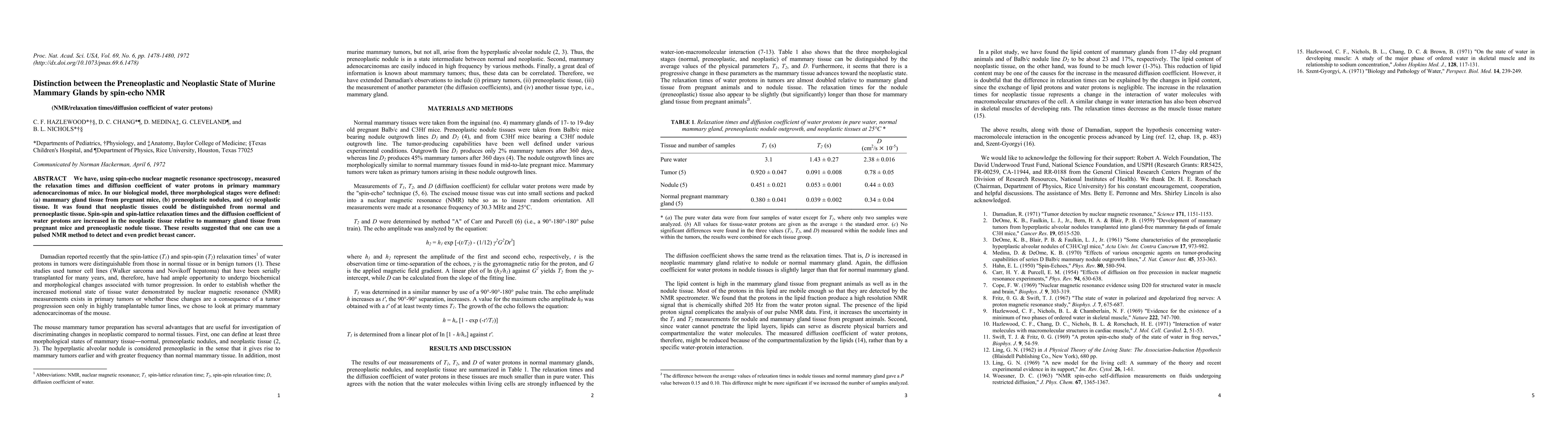 This study uses spin-echo NMR spectroscopy to differentiate between preneoplastic and neoplastic states in murine mammary glands by measuring water proton relaxation times and diffusion coefficients. Neoplastic tissues show increased spin-spin and spin-lattice relaxation times and diffusion coefficient compared to normal and preneoplastic tissues, indicating potential for NMR in breast cancer detection.