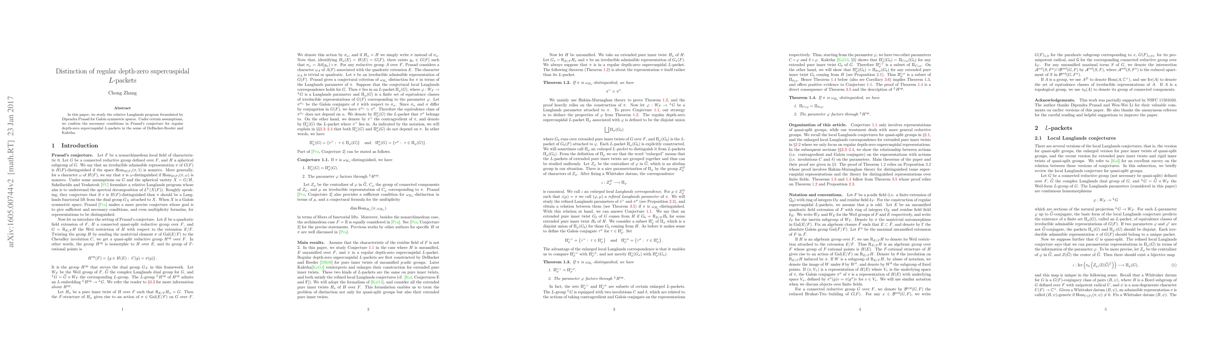This paper investigates the relative Langlands program by Dipendra Prasad for Galois symmetric spaces and verifies the essential conditions of Prasad's conjecture for regular depth-zero supercuspidal L-packets under specific assumptions.