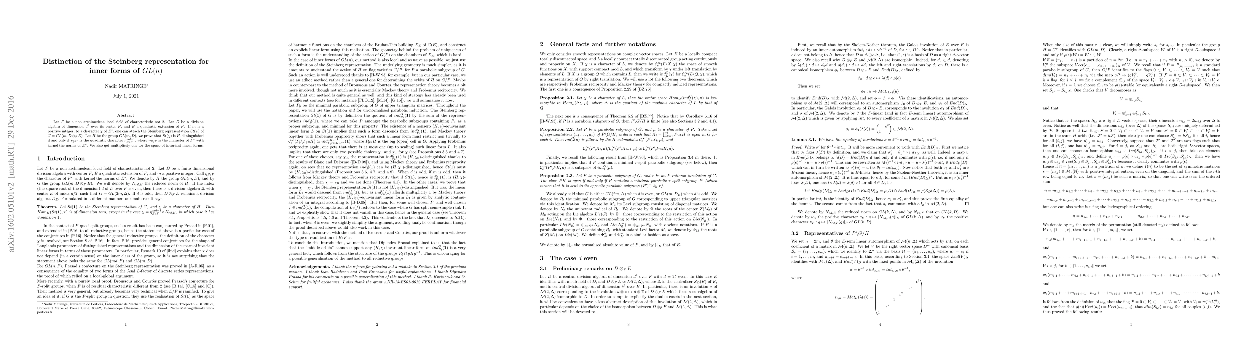 This paper proves that the Steinberg representation $St(\chi)$ of $GL(m,D\otimes_F E)$ is $H$-distinguished if and only if $\chi_{|F^*}$ equals the quadratic character $\eta_{E/F}^{md-1}$, establishing multiplicity one for invariant linear forms and confirming that the Jacquet-Langlands correspondence preserves distinction for these representations.
