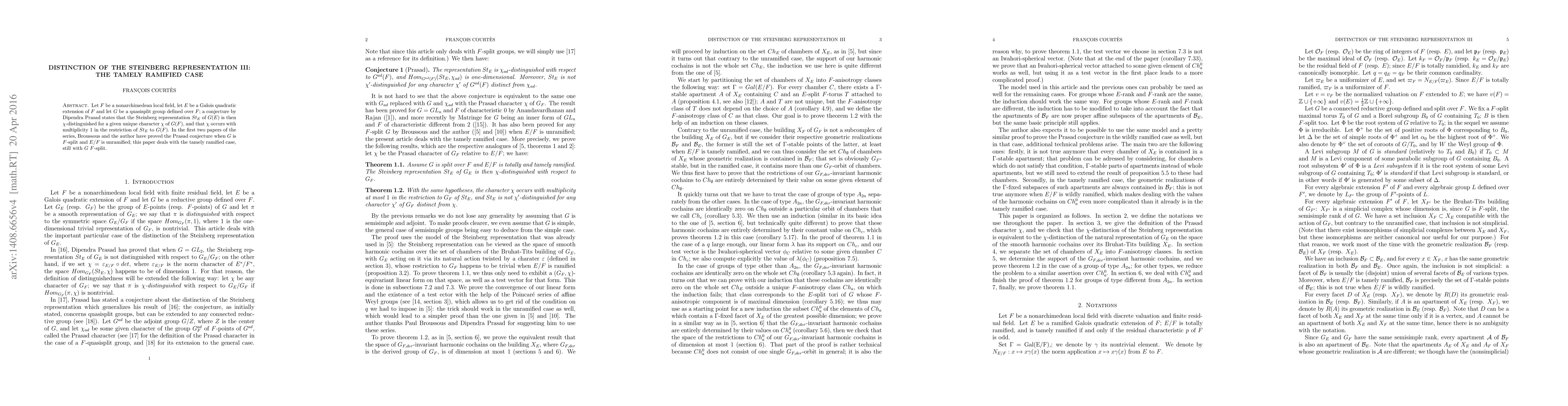 Let $F$ be a nonarchimedean local field, let $E$ be a Galois quadratic extension of $F$ and let $G$ be a quasisplit group defined over $F$; a conjecture by Dipendra Prasad states that the Steinberg representation of $G(E)$ is then $\chi$-distinguished for a given unique character $\chi$ of $G(F)$. In the first two papers of the series, Broussous and the author have proved that result when $G$ is $F$-split and $E/F$ is unramified; this paper deals with the tamely ramified case, still with $G$ $F$-split.