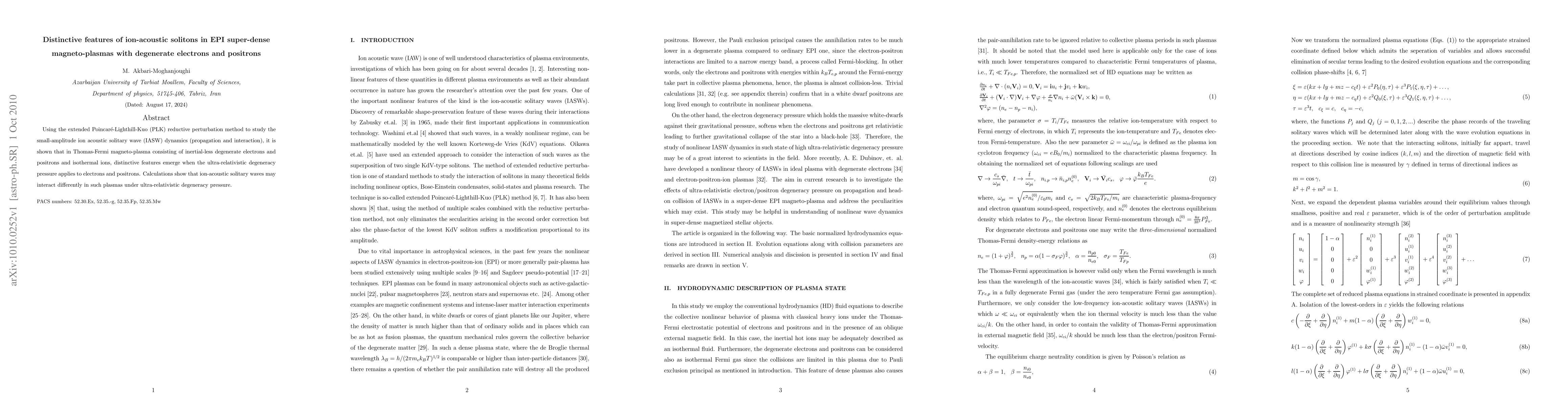 This paper investigates the dynamics of ion-acoustic solitary waves in super-dense magneto-plasmas with degenerate electrons and positrons using the extended PLK method. It reveals unique interaction features of these waves under ultra-relativistic degeneracy pressure in Thomas-Fermi plasmas.