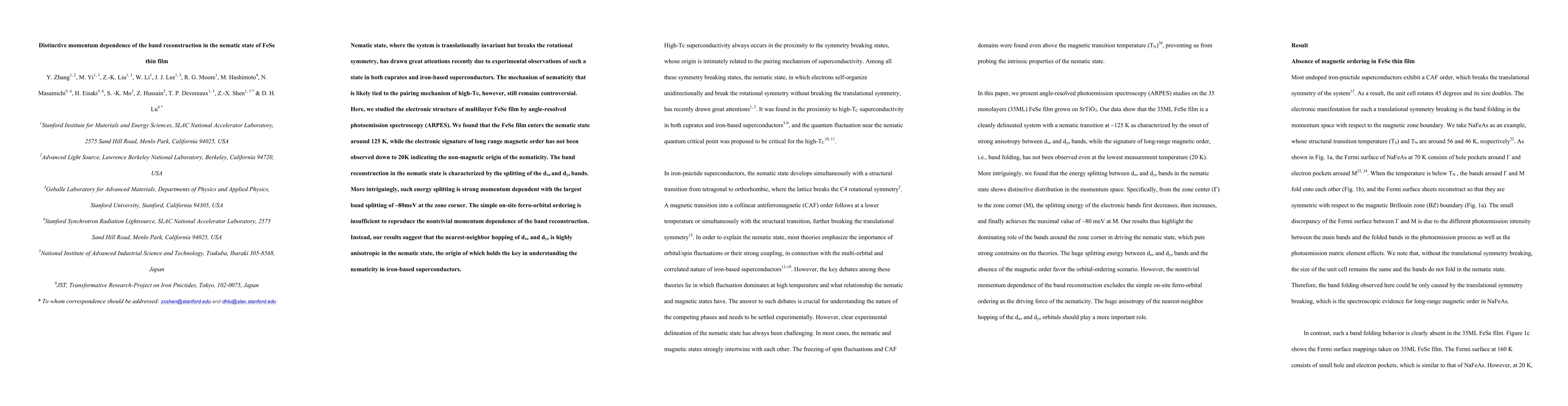 Nematic state, where the system is translationally invariant but breaks the rotational symmetry, has drawn great attentions recently due to experimental observations of such a state in both cuprates and iron-based superconductors. The mechanism of nematicity that is likely tied to the pairing mechanism of high-Tc, however, still remains controversial. Here, we studied the electronic structure of multilayer FeSe film by angle-resolved photoemission spectroscopy (ARPES). We found that the FeSe film enters the nematic state around 125 K, while the electronic signature of long range magnetic order has not been observed down to 20K indicating the non-magnetic origin of the nematicity. The band reconstruction in the nematic state is characterized by the splitting of the dxz and dyz bands. More intriguingly, such energy splitting is strong momentum dependent with the largest band splitting of ~80meV at the zone corner. The simple on-site ferro-orbital ordering is insufficient to reproduce the nontrivial momentum dependence of the band reconstruction. Instead, our results suggest that the nearest-neighbor hopping of dxz and dyz is highly anisotropic in the nematic state, the origin of which holds the key in understanding the nematicity in iron-based superconductors.