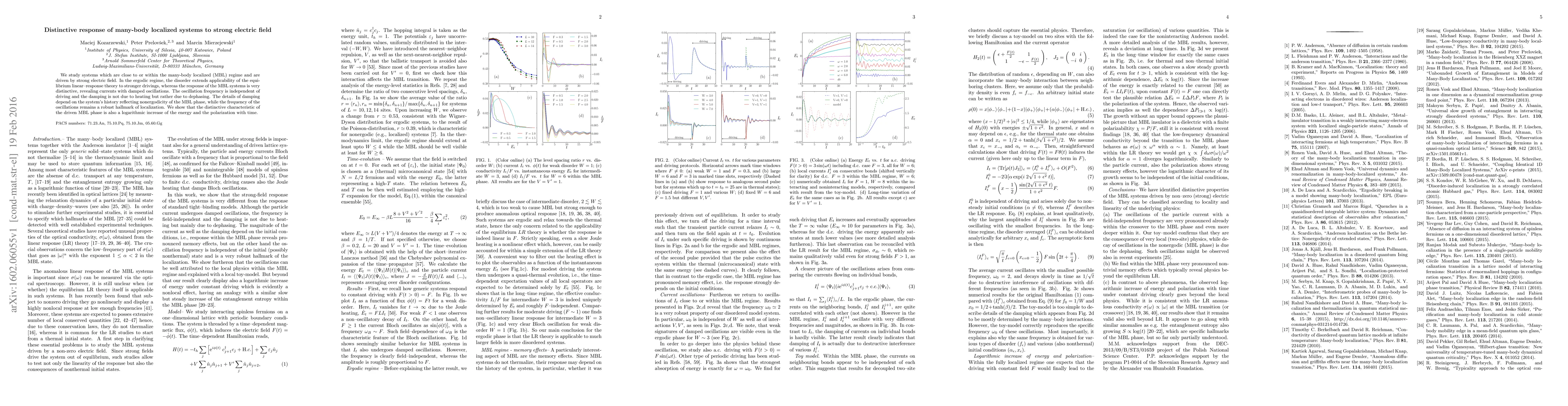We study systems which are close to or within the many-body localized (MBL) regime and are driven by strong electric field. In the ergodic regime, the disorder extends applicability of the equilibrium linear--response theory to stronger drivings, whereas the response of the MBL systems is very distinctive, revealing currents with damped oscillations. The oscillation frequency is independent of driving and the damping is not due to heating but rather due to dephasing. The details of damping depend on the system's history reflecting nonergodicity of the MBL phase, while the frequency of the oscillations remains a robust hallmark of localization. We show that the distinctive characteristic of the driven MBL phase is also a logarithmic increase of the energy and the polarization with time.