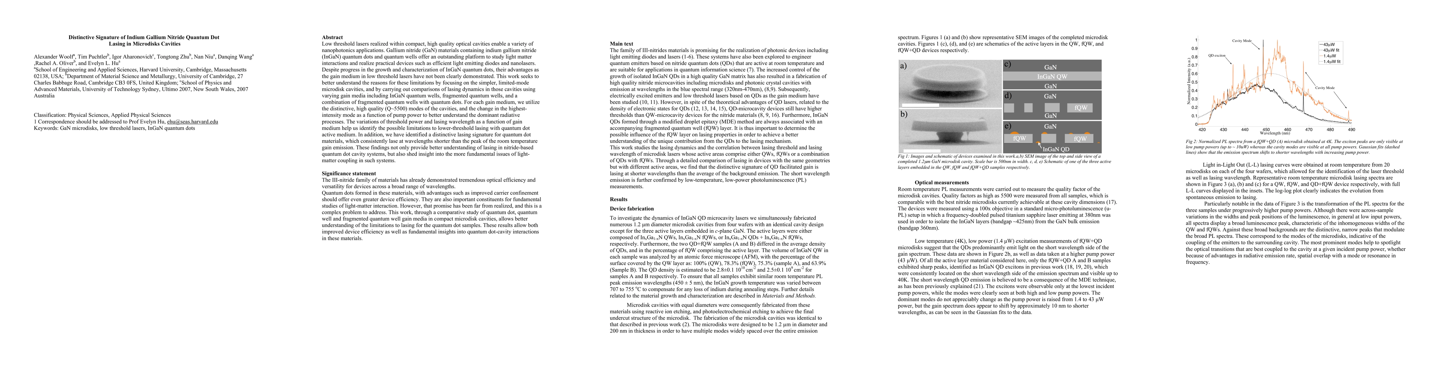 This research investigates the lasing characteristics of indium gallium nitride (InGaN) quantum dot materials within microdisk cavity systems, comparing them to quantum wells. It identifies a distinctive lasing signature for quantum dot materials, revealing they consistently lase at shorter wavelengths than their peak gain emission, thus providing insights into light-matter coupling in nitride-based quantum dot systems.