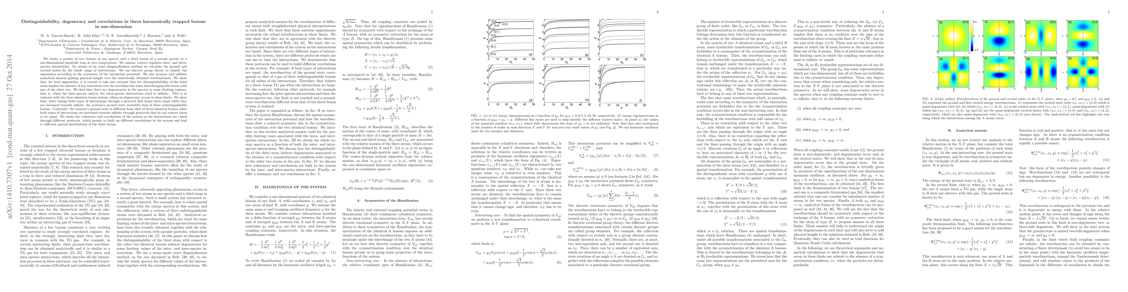 We study a system of two bosons of one species and a third boson of a second species in a one-dimensional parabolic trap at zero temperature. We assume contact repulsive inter- and intra-species interactions. By means of an exact diagonalization method we calculate the ground and excited states for the whole range of interactions. We use discrete group theory to classify the eigenstates according to the symmetry of the interaction potential. We also propose and validate analytical ansatzs gaining physical insight over the numerically obtained wavefunctions. We show that, for both approaches, it is crucial to take into account that the distinguishability of the third atom implies the absence of any restriction over the wavefunction when interchanging this boson with any of the other two. We find that there are degeneracies in the spectra in some limiting regimes, that is, when the inter-species and/or the intra-species interactions tend to infinity. This is in contrast with the three-identical boson system, where no degeneracy occurs in these limits. We show that, when tuning both types of interactions through a protocol that keeps them equal while they are increased towards infinity, the systems's ground state resembles that of three indistinguishable bosons. Contrarily, the systems's ground state is different from that of three-identical bosons when both types of interactions are increased towards infinity through protocols that do not restrict them to be equal. We study the coherence and correlations of the system as the interactions are tuned through different protocols, which permit to built up different correlations in the system and lead to different spatial distributions of the three atoms.