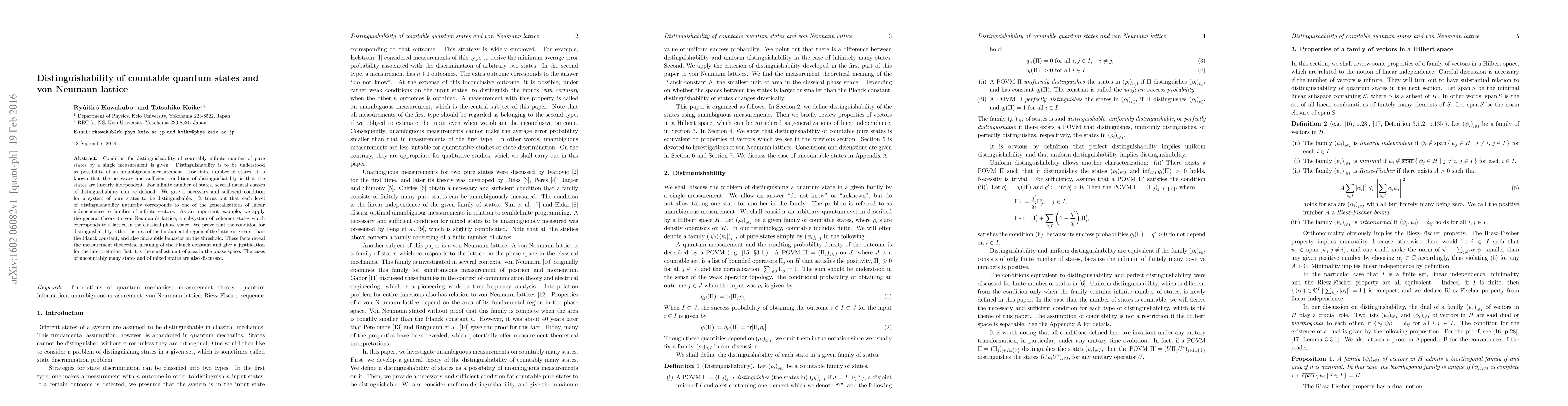 This paper provides a necessary and sufficient condition for the distinguishability of countably infinite pure quantum states via a single measurement. It reveals that different levels of distinguishability correspond to various generalizations of linear independence for infinite vectors, and applies this theory to von Neumann's lattice, showing that distinguishability requires the area of the lattice's fundamental region to exceed the Planck constant.