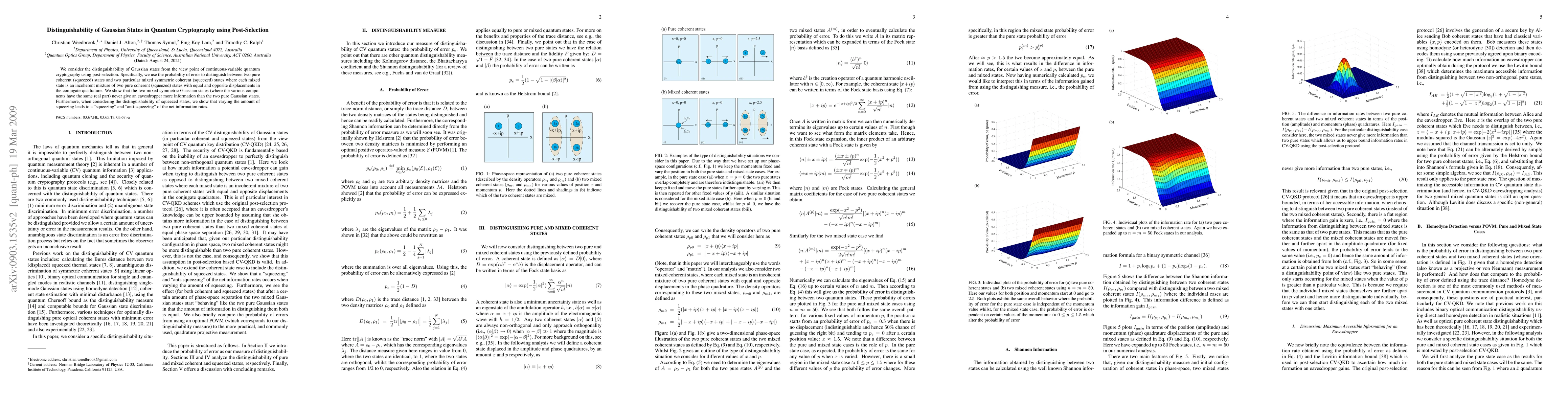 This paper investigates the distinguishability of Gaussian states in continuous-variable quantum cryptography using post-selection, focusing on the probability of error between pure and mixed coherent (squeezed) states. It concludes that mixed symmetric Gaussian states do not provide an eavesdropper with more information than pure states, and varying squeezing alters the net information rates in a "squeezing" and "anti-squeezing" manner.