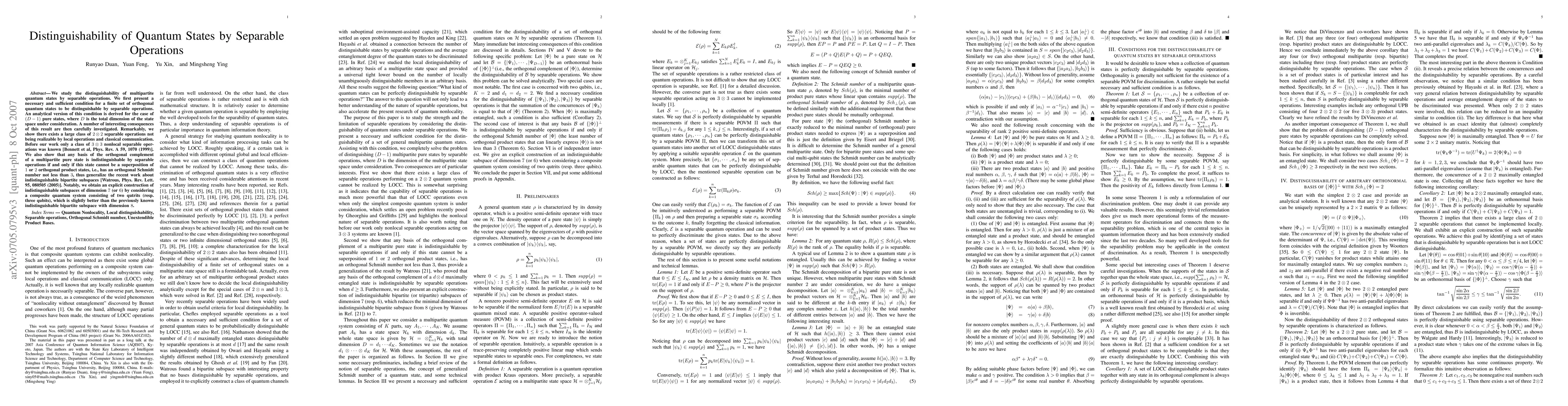 This paper presents a necessary and sufficient condition for distinguishing multipartite quantum states using separable operations, deriving an analytical version for $(D-1)$ pure states. It reveals a significant class of $2\otimes 2$ separable operations that cannot be achieved through local operations and classical communication, extending beyond the previously known $3\otimes 3$ nonlocal operations.