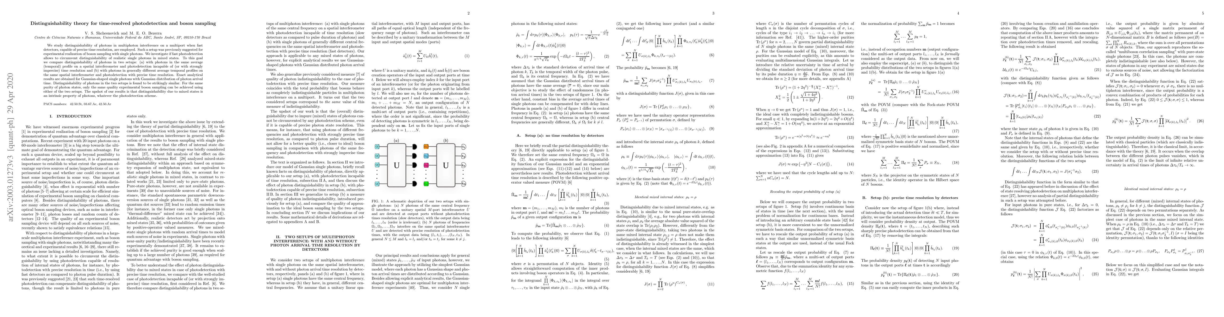 This paper explores the distinguishability of photons in multiphoton interference setups with fast time-resolved photodetection, comparing it to traditional setups with imprecise time resolution. The study finds that regardless of the detection method, the distinguishability of photons in mixed states remains an intrinsic property, limiting the quality of boson sampling.
