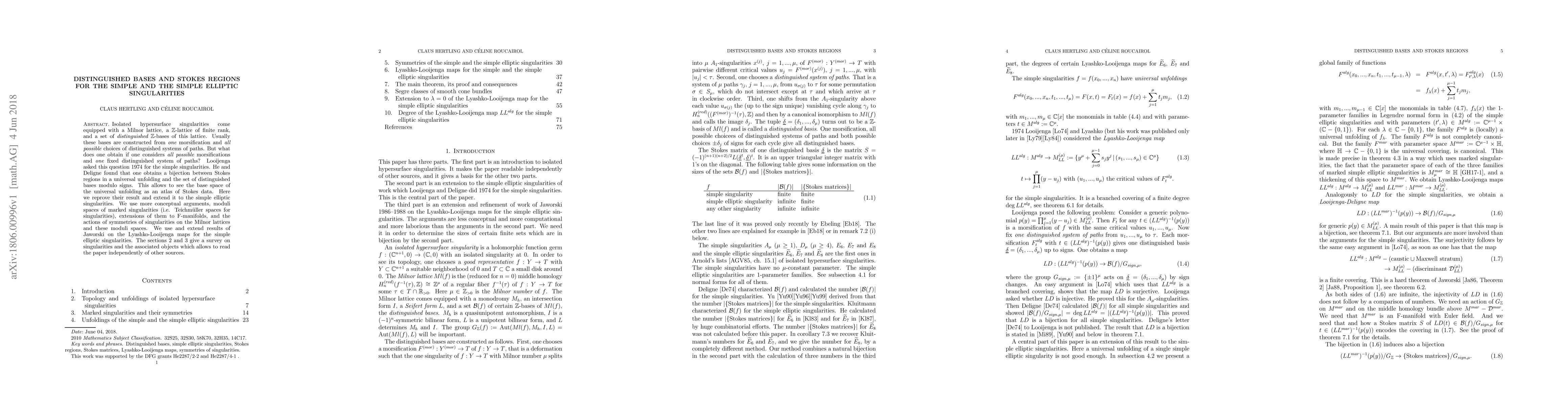 This paper reproves and extends Looijenga and Deligne's results on the bijection between Stokes regions in universal unfoldings and distinguished bases for simple singularities, applying these findings to simple elliptic singularities using moduli spaces and symmetry actions.