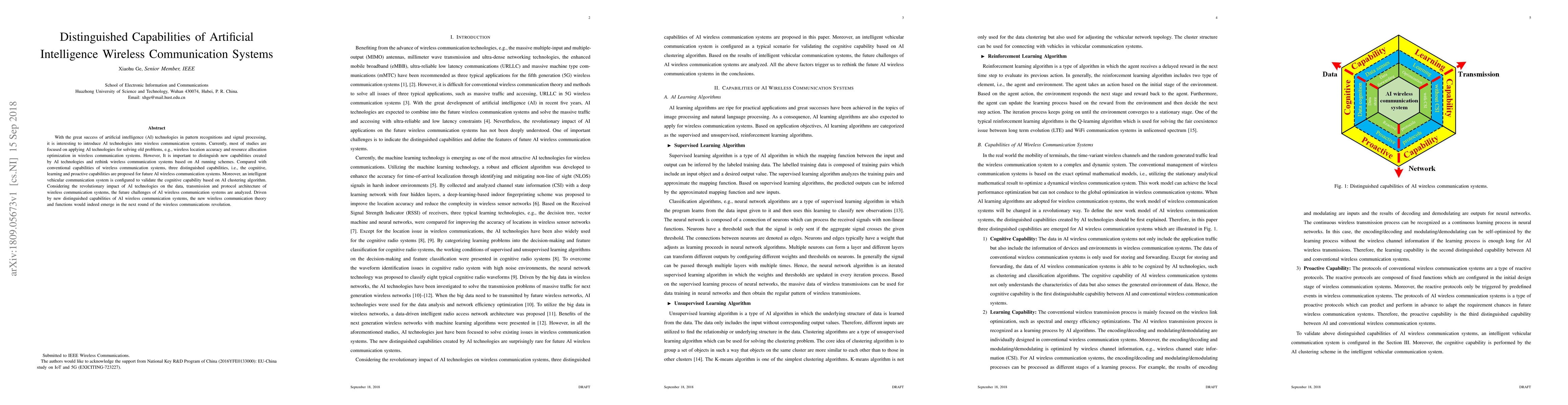 With the great success of artificial intelligence (AI) technologies in pattern recognitions and signal processing, it is interesting to introduce AI technologies into wireless communication systems. Currently, most of studies are focused on applying AI technologies for solving old problems, e.g., wireless location accuracy and resource allocation optimization in wireless communication systems. However, It is important to distinguish new capabilities created by AI technologies and rethink wireless communication systems based on AI running schemes. Compared with conventional capabilities of wireless communication systems, three distinguished capabilities, i.e., the cognitive, learning and proactive capabilities are proposed for future AI wireless communication systems. Moreover, an intelligent vehicular communication system is configured to validate the cognitive capability based on AI clustering algorithm. Considering the revolutionary impact of AI technologies on the data, transmission and protocol architecture of wireless communication systems, the future challenges of AI wireless communication systems are analyzed. Driven by new distinguished capabilities of AI wireless communication systems, the new wireless communication theory and functions would indeed emerge in the next round of the wireless communications revolution.