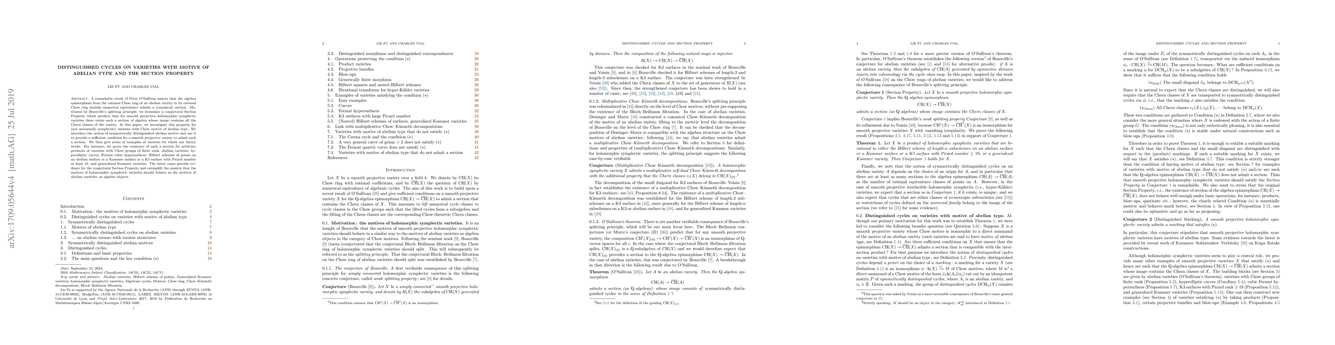 A remarkable result of Peter O'Sullivan asserts that the algebra epimorphism from the rational Chow ring of an abelian variety to its rational Chow ring modulo numerical equivalence admits a (canonical) section. Motivated by Beauville's splitting principle, we formulate a conjectural Section Property which predicts that for smooth projective holomorphic symplectic varieties there exists such a section of algebra whose image contains all the Chern classes of the variety. In this paper, we investigate this property for (not necessarily symplectic) varieties with Chow motive of abelian type. We introduce the notion of symmetrically distinguished abelian motive and use it to provide a sufficient condition for a smooth projective variety to admit such a section. We then give series of examples of varieties for which our theory works. For instance, we prove the existence of such a section for arbitrary products of varieties with Chow groups of finite rank, abelian varieties, hyperelliptic curves, Fermat cubic hypersurfaces, Hilbert schemes of points on an abelian surface or a Kummer surface or a K3 surface with Picard number at least 19, and generalized Kummer varieties. The latter cases provide evidence for the conjectural Section Property and exemplify the mantra that the motives of holomorphic symplectic varieties should behave as the motives of abelian varieties, as algebra objects.