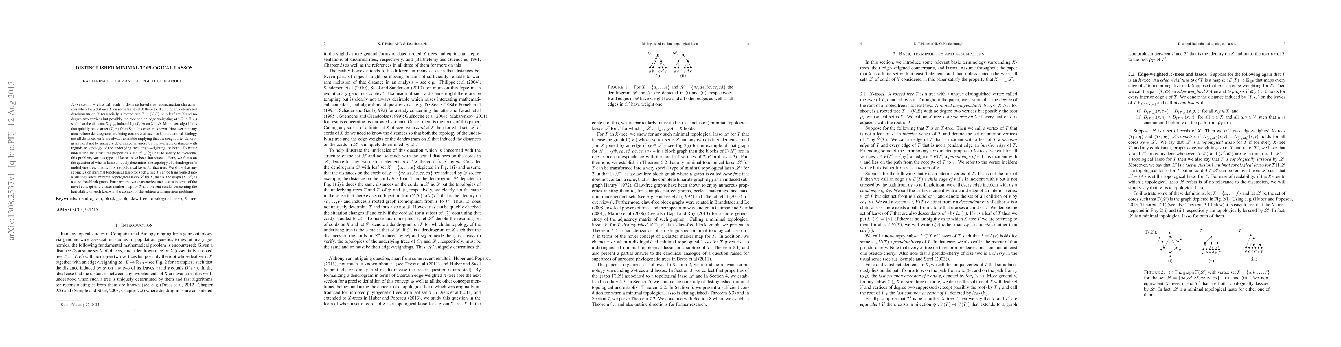 A classical result in distance based tree-reconstruction characterizes when for a distance $D$ on some finite set $X$ there exist a uniquely determined dendrogram on $X$ (essentially a rooted tree $T=(V,E)$ with leaf set $X$ and no degree two vertices but possibly the root and an edge weighting $\omega:E\to \mathbb R_{\geq 0}$) such that the distance $D_{(T,\omega)}$ induced by $(T,\omega)$ on $X$ is $D$. Moreover, algorithms that quickly reconstruct $(T,\omega)$ from $D$ in this case are known. However in many areas where dendrograms are being constructed such as Computational Biology not all distances on $X$ are always available implying that the sought after dendrogram need not be uniquely determined anymore by the available distances with regards to topology of the underlying tree, edge-weighting, or both. To better understand the structural properties a set $\cL\subseteq {X\choose 2}$ has to satisfy to overcome this problem, various types of lassos have been introduced. Here, we focus on the question of when a lasso uniquely determines the topology of a dendrogram's underlying tree, that is, it is a topological lasso for that tree. We show that any set-inclusion minimal topological lasso for such a tree $T$ can be transformed into a 'distinguished' minimal topological lasso $\cL$ for $T$, that is, the graph $(X,\cL)$ is a claw-free block graph. Furthermore, we characterize such lassos in terms of the novel concept of a cluster marker map for $T$ and present results concerning the heritability of such lassos in the context of the subtree and supertree problems.
