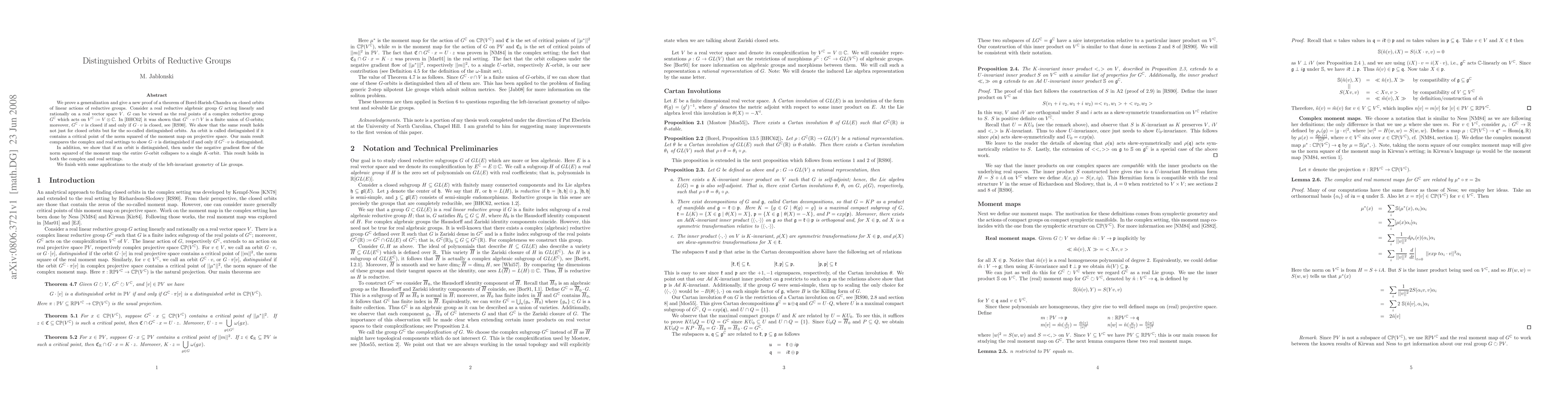 We prove a generalization of a theorem of Borel-Harish-Chandra on closed orbits of linear actions of reductive groups. Consider a real reductive algebraic group $G$ acting linearly and rationally on a real vector space $V$. $G$ can be viewed as the real points of a complex reductive group $G^\mathbb C$ which acts on $V^\mathbb C := V \otimes \mathbb C$. Borel-Harish-Chandra show that $G^\mathbb C \cdot v \cap V$ is a finite union of $G$-orbits; moreover, $G^\mathbb C \cdot v$ is closed if and only if $G\cdot v$ is closed. We show that the same result holds not just for closed orbits but for the so-called distinguished orbits. An orbit is called distinguished if it contains a critical point of the norm squared of the moment map on projective space. Our main result compares the complex and real settings to show $G\cdot v$ is distinguished if and only if $G^\mathbb C \cdot v$ is distinguished. In addition, we show that if an orbit is distinguished, then under the negative gradient flow of the norm squared of the moment map the entire $G$-orbit collapses to a single $K$-orbit. This result holds in both the complex and real settings. We finish with some applications to the study of the left-invariant geometry of Lie groups.