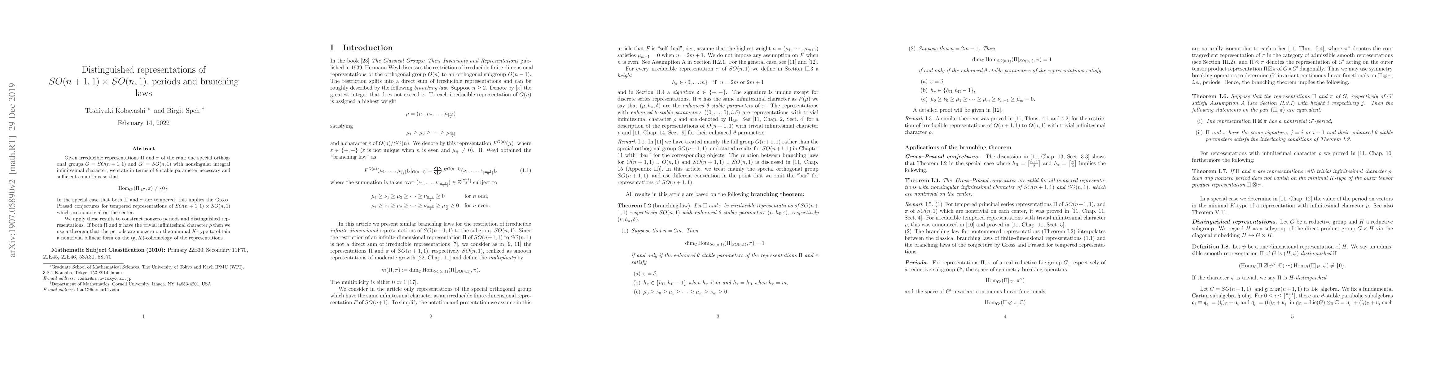 Given irreducible representations $\Pi$ and $\pi$ of the rank one special orthogonal groups $G=SO(n+1,1)$ and $G'=SO(n,1)$ with nonsingular integral infinitesimal character, we state in terms of $\theta$-stable parameter necessary and sufficient conditions so that \[ \operatorname{Hom}_{G'}(\Pi|_{G'}, \pi )\not = \{0\}. \] In the special case that both $\Pi$ and $\pi$ are tempered, this implies the Gross--Prasad conjectures for tempered representations of $SO(n+1,1) \times SO(n,1)$ which are nontrivial on the center. We apply these results to construct nonzero periods and distinguished representations. If both $\Pi$ and $ \pi$ have the trivial infinitesimal character $\rho$ then we use a theorem that the periods are nonzero on the minimal $K$-type to obtain a nontrivial bilinear form on the $({\mathfrak g},K)$-cohomology of the representations.