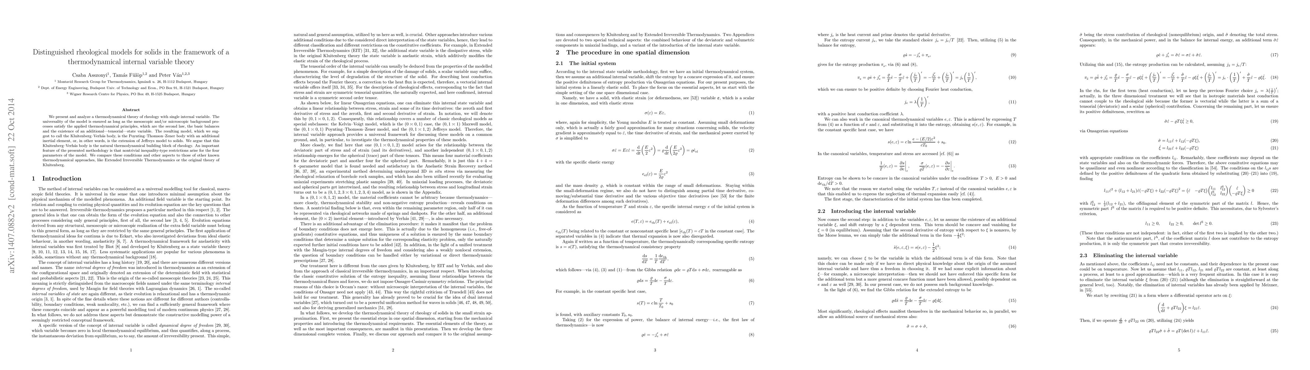 We present and analyze a thermodynamical theory of rheology with single internal variable. The universality of the model is ensured as long as the mesoscopic and/or microscopic background processes satisfy the applied thermodynamical principles, which are the second law, the basic balances and the existence of an additional-tensorial-state variable. The resulting model, which we suggest to call the Kluitenberg-Verh\'as body, is the Poynting-Thomson-Zener body with an additional inertial element, or, in other words, is the extension of Jeffreys model to solids. We argue that this Kluitenberg-Verh\'as body is the natural thermodynamical building block of rheology. An important feature of the presented methodology is that nontrivial inequality-type restrictions arise for the four parameters of the model. We compare these conditions and other aspects to those of other known thermodynamical approaches, like Extended Irreversible Thermodynamics or the original theory of Kluitenberg.