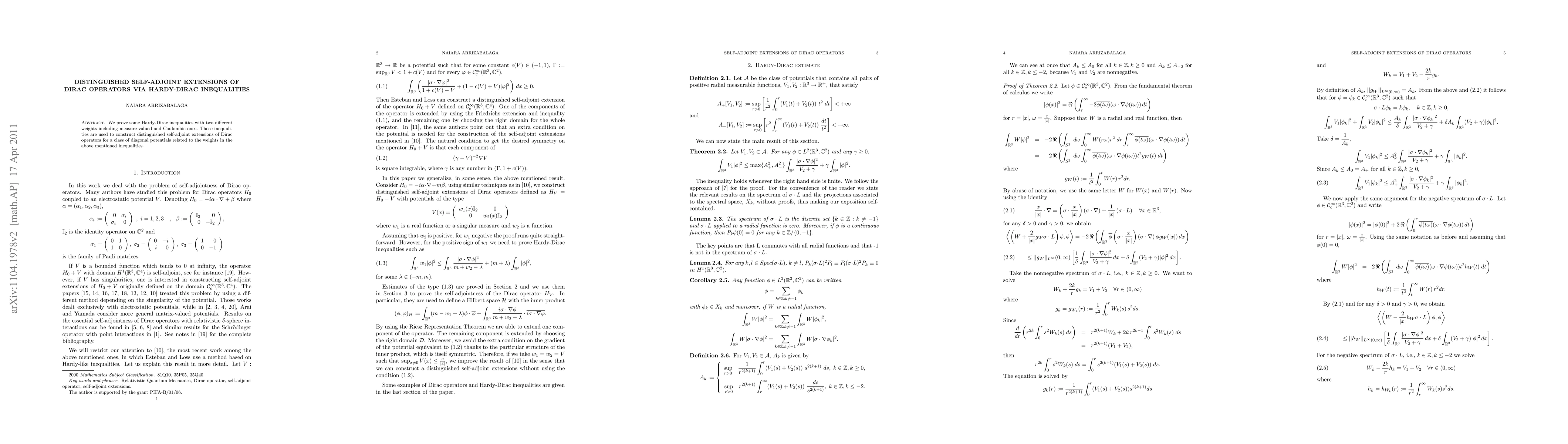 This paper proves Hardy-Dirac inequalities with various weights to construct distinguished self-adjoint extensions of Dirac operators for a class of diagonal potentials linked to these weights. The inequalities play a crucial role in the construction process.