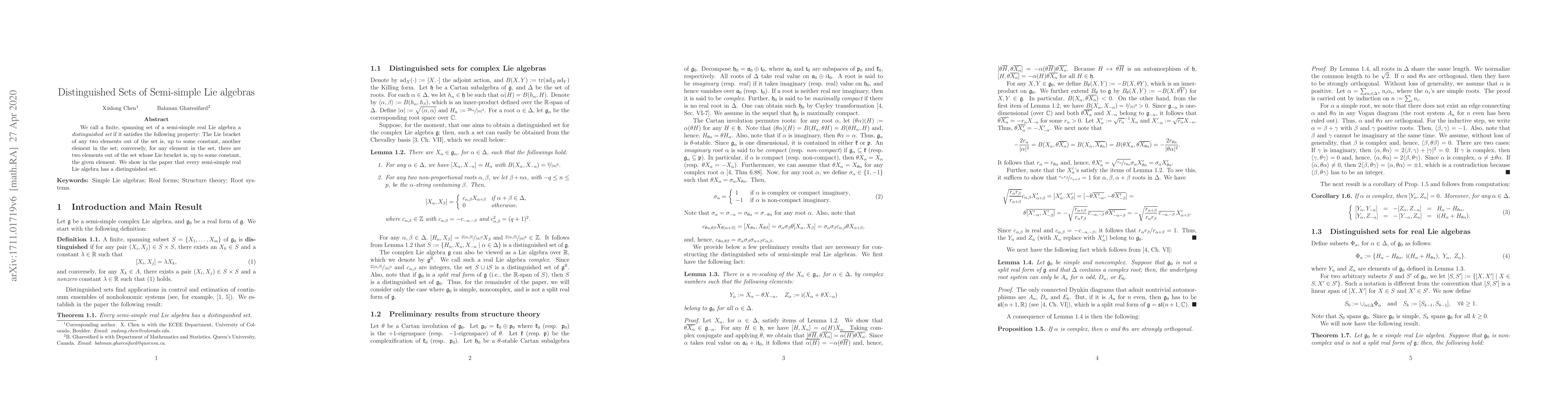 We call a finite, spanning set of a semi-simple real Lie algebra a distinguished set if it satisfies the following property: The Lie bracket of any two elements out of the set is, up to some constant, another element in the set; conversely, for any element in the set, there are two elements out of the set whose Lie bracket is, up to some constant, the given element. We show in the paper that every semi-simple real Lie algebra has a distinguished set.