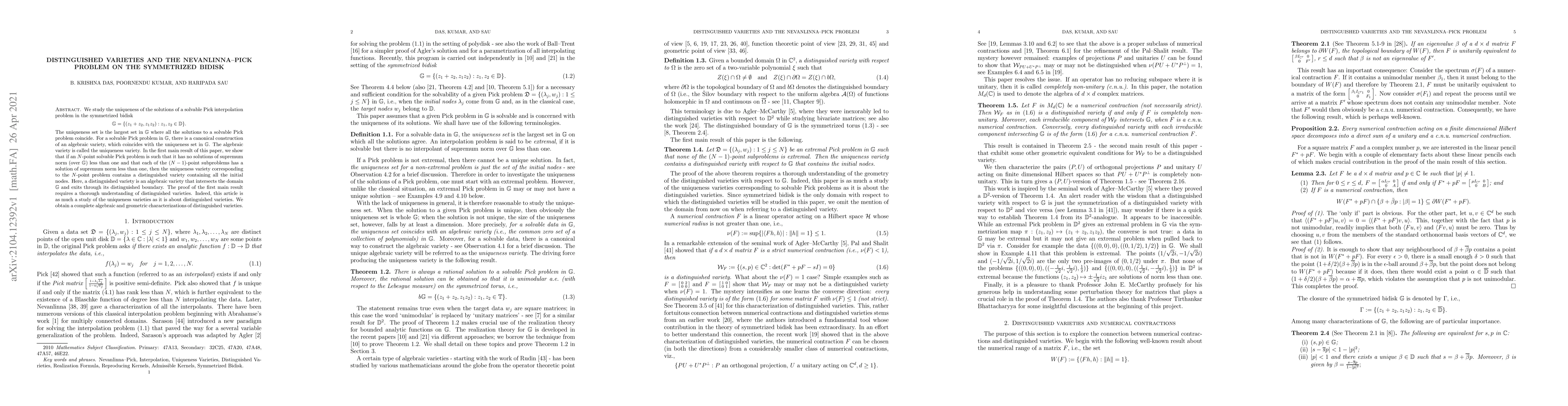 Starting with a solvable Nevanlinna-Pick interpolation problem with the initial data coming from the symmetrized bidisk, this paper studies the corresponding uniqueness set, i.e., the largest set in the domain where all solutions to the problem coincide. It is shown that the uniqueness set coincides with an algebraic variety in the domain. The algebraic variety - canonically constructed from the interpolation data - is called the uniqueness variety. It was shown that the uniqueness variety contains a distinguished variety which by definition is the zero set of a two-variable polynomial that intersects the domain and exits through its distinguished boundary. A complete algebraic and geometric characterizations of distinguished varieties are obtained in this paper.