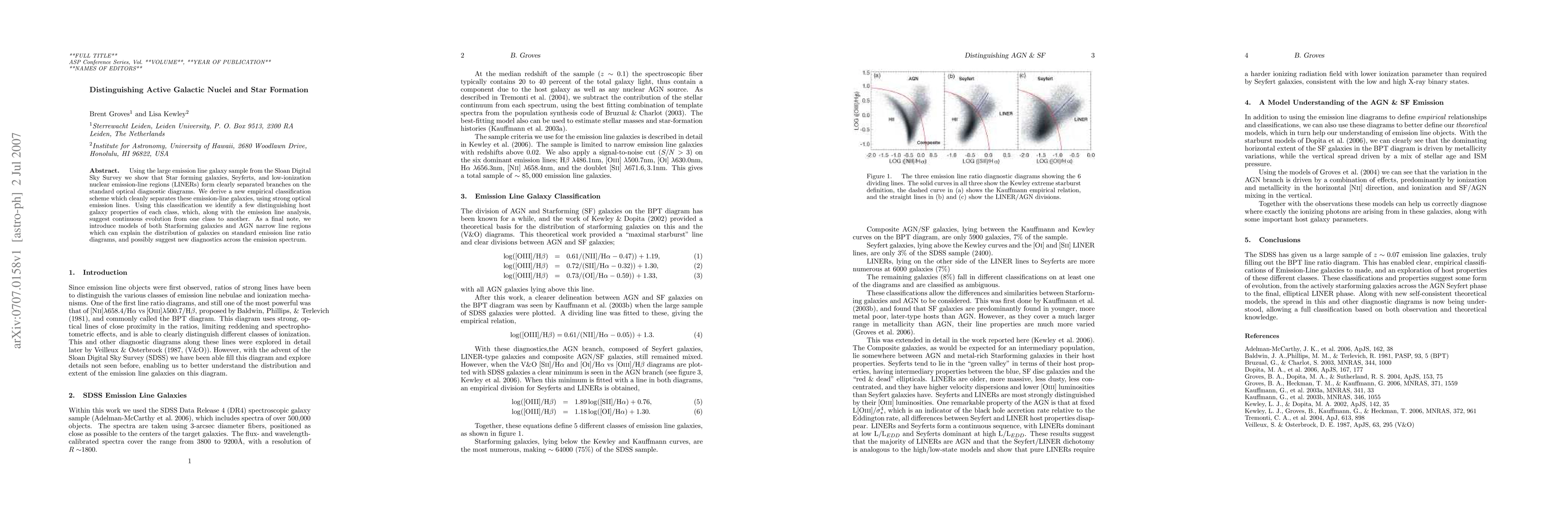 Using the large emission line galaxy sample from the Sloan Digital Sky Survey we show that Star forming galaxies, Seyferts, and low-ionization nuclear emission-line regions (LINERs) form clearly separated branches on the standard optical diagnostic diagrams. We derive a new empirical classification scheme which cleanly separates these emission-line galaxies, using strong optical emission lines. Using this classification we identify a few distinguishing host galaxy properties of each class, which, along with the emission line analysis, suggest continuous evolution from one class to another. As a final note, we introduce models of both Starforming galaxies and AGN narrow line regions which can explain the distribution of galaxies on standard emission line ratio diagrams, and possibly suggest new diagnostics across the emission spectrum.