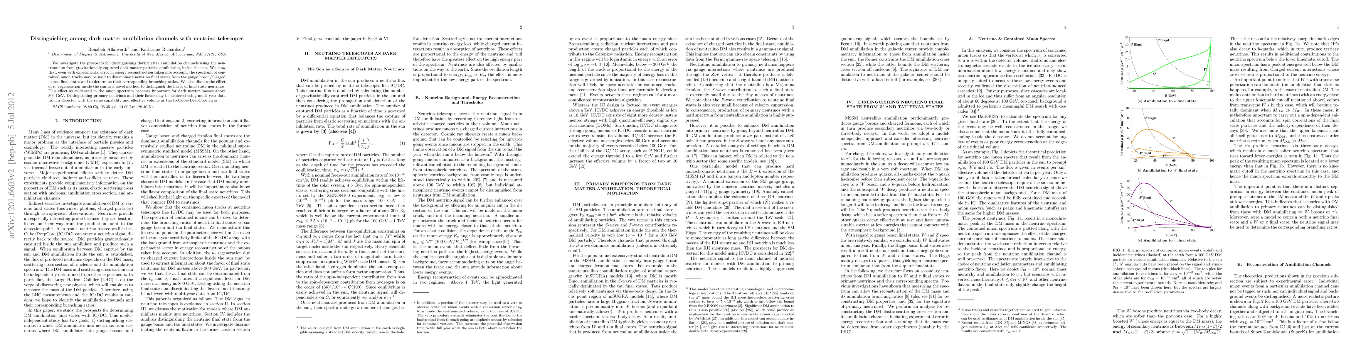 Researchers investigate using neutrino telescopes to distinguish dark matter annihilation channels based on muon track spectra and flavor regeneration effects in the sun, enabling detection of different types of final states.