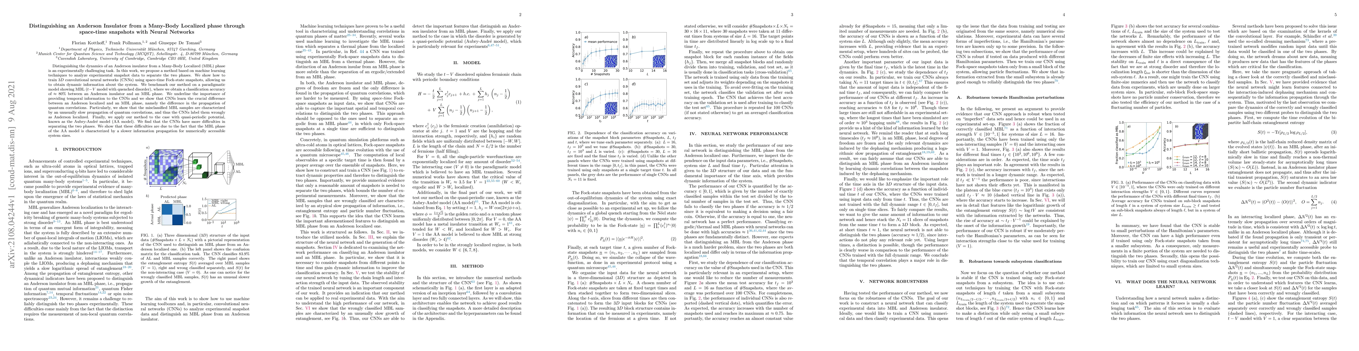 This paper proposes a machine learning method using 3D convolutional neural networks (CNNs) to distinguish between Anderson insulators and Many-Body Localized phases by analyzing space-time snapshots of experimental data. The method successfully classifies these phases with approximately 80% accuracy, highlighting the importance of temporal information in CNNs and the difference in quantum correlation propagation between the two phases.