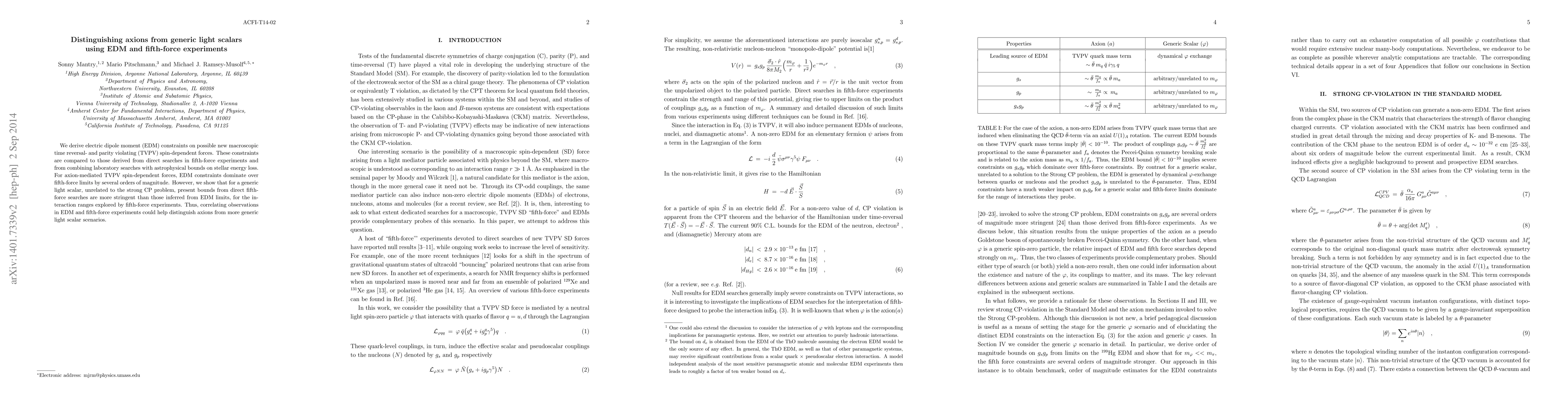 This paper compares electric dipole moment (EDM) constraints to fifth-force experiments for distinguishing axions from generic light scalars. EDM constraints dominate for axions but are less stringent than fifth-force experiments for generic scalars, suggesting a correlation between these experiments could help differentiate axion scenarios from others.