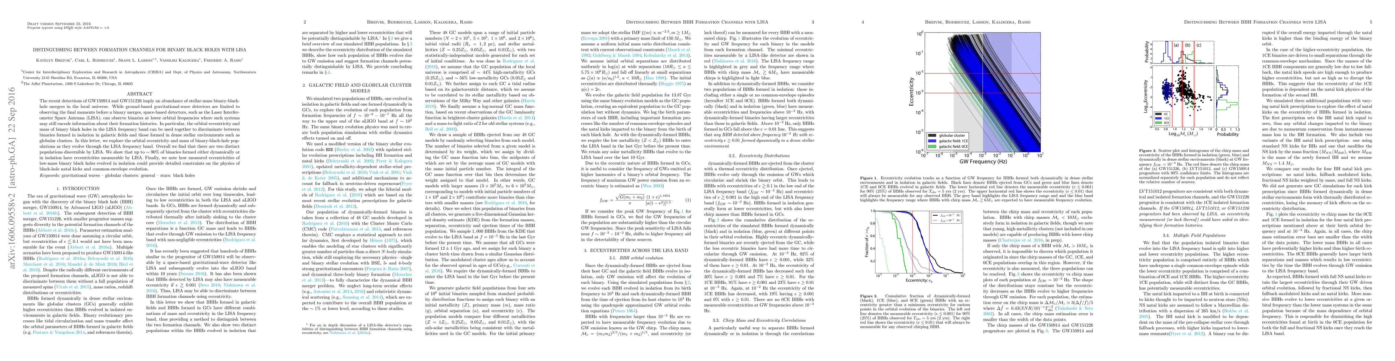 This paper investigates how the Laser Interferometer Space Antenna (LISA) can distinguish between different formation channels for binary black holes by analyzing their orbital eccentricities and masses. LISA's ability to observe binaries at lower frequencies allows it to discern two distinct populations, providing insights into their formation environments and constraints on black hole formation processes.