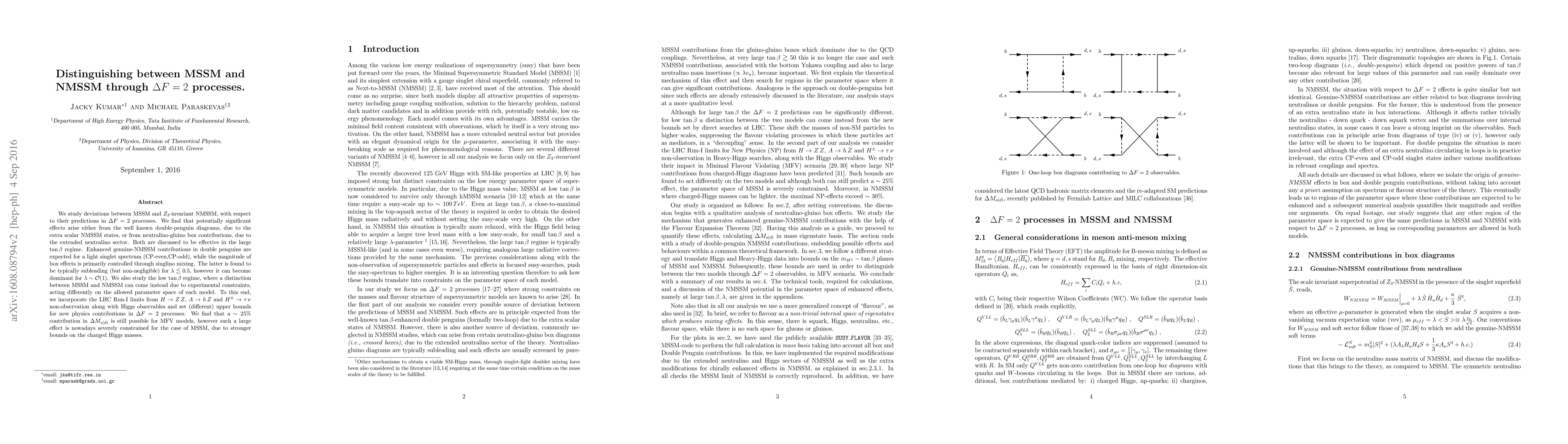 We study deviations between MSSM and $Z_3$-invariant NMSSM, with respect to their predictions in $\Delta F=2 $ processes. We find that potentially significant effects arise either from the well known double-penguin diagrams, due to the extra scalar NMSSM states, or from neutralino-gluino box contributions, due to the extended neutralino sector. Both are discussed to be effective in the large $\tan\beta$ regime. Enhanced genuine-NMSSM contributions in double penguins are expected for a light singlet spectrum (CP-even,CP-odd), while the magnitude of box effects is primarily controlled through singlino mixing. The latter is found to be typically subleading (but non-negligible) for $\lambda \lesssim 0.5$, however it can become dominant for $\lambda\sim \mathcal{O}(1)$. We also study the low $\tan\beta$ regime, where a distinction between MSSM and NMSSM can come instead due to experimental constraints, acting differently on the allowed parameter space of each model. To this end, we incorporate the LHC Run-I limits from $H\rightarrow Z Z$, $A \rightarrow hZ$ and $H^\pm \rightarrow \tau \nu $ non-observation along with Higgs observables and set (different) upper bounds for new physics contributions in $\Delta F=2 $ processes. We find that a $\sim 25\%$ contribution in $\Delta M_{s(d)}$ is still possible for MFV models, however such a large effect is nowadays severely constrained for the case of MSSM, due to stronger bounds on the charged Higgs masses.