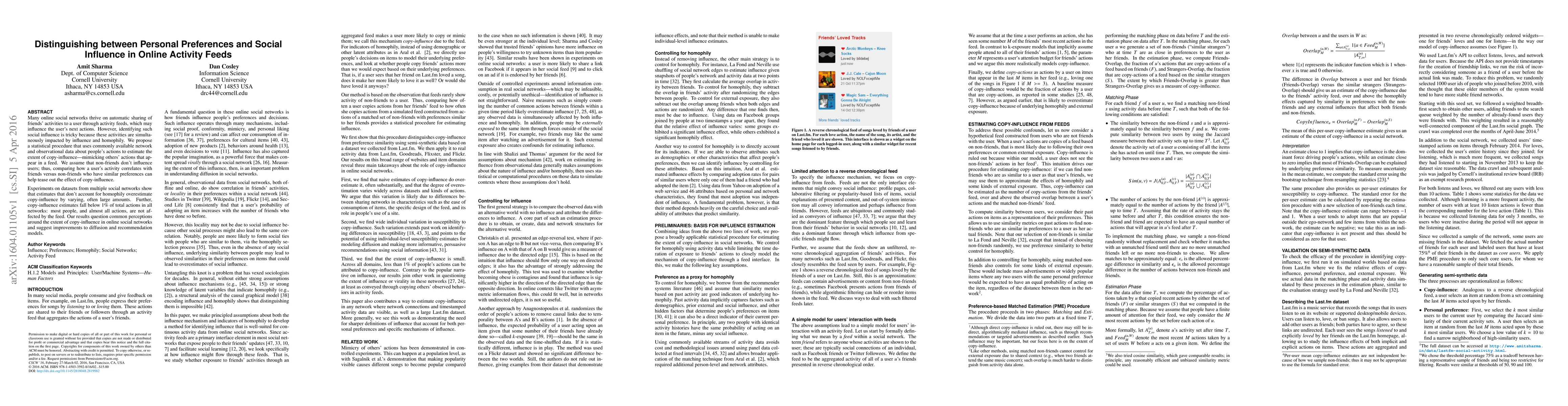This research proposes a statistical method to differentiate between personal preferences and social influence in online activity feeds. Experiments on various social networks reveal that copy-influence, or mimicking others' actions seen in a feed, accounts for less than 1% of total actions. The findings challenge common assumptions about the extent of social influence in online networks and suggest improvements to recommendation and diffusion models.