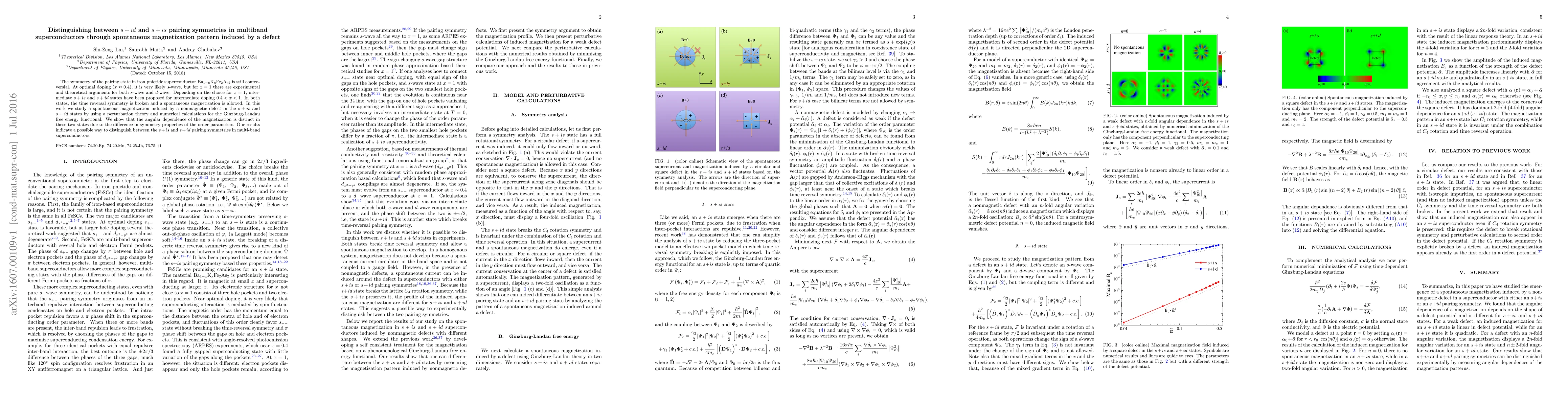 This paper investigates the distinct spontaneous magnetization patterns induced by defects in $s+is$ and $s+id$ pairing symmetries in multiband superconductors, using perturbation theory and numerical calculations. The study reveals unique angular dependences that can help distinguish between these pairing states in iron pnictides.