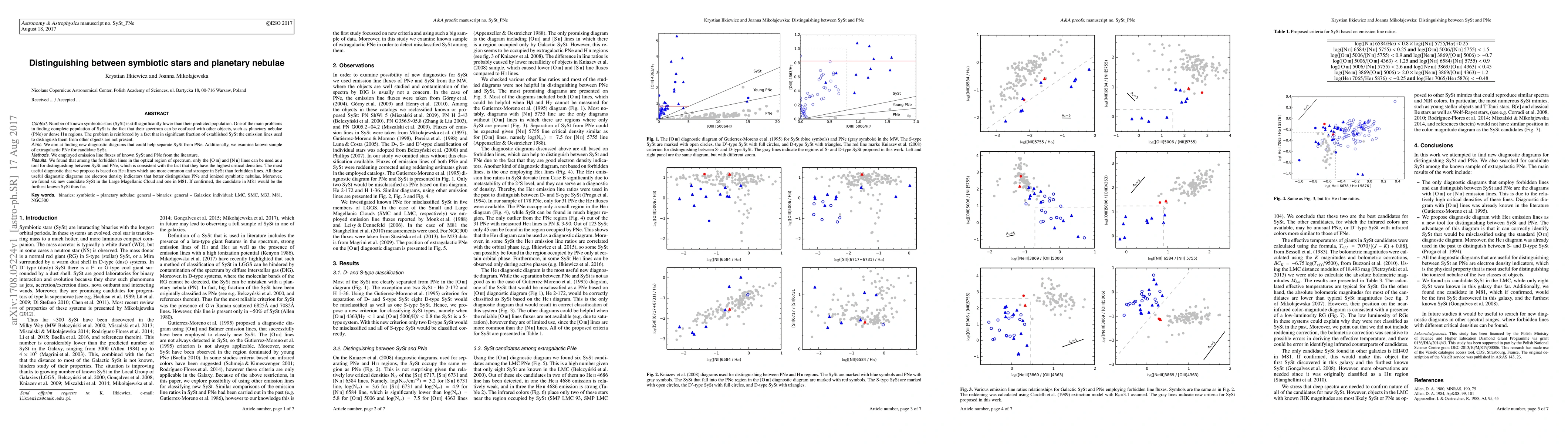 This paper proposes new diagnostic diagrams to distinguish symbiotic stars (SySt) from planetary nebulae (PNe) using emission lines, particularly focusing on He I lines, which are more prevalent in SySt. The authors identified [O III] and [N II] lines as useful for distinguishing between SySt and PNe, and found six new candidate SySt in the Large Magellanic Cloud and one in M81, potentially the furthest known SySt.