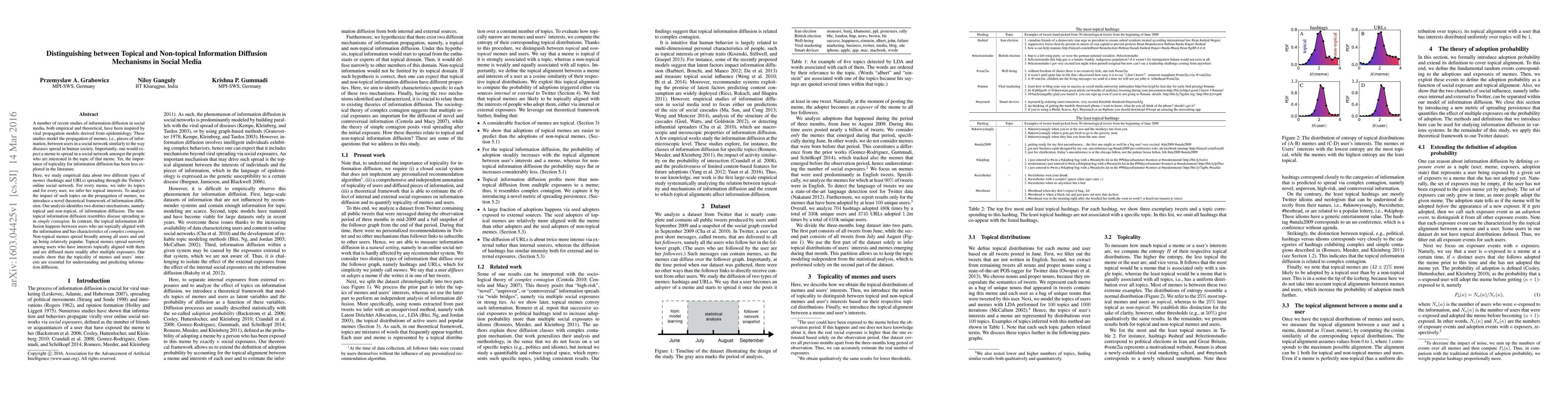 This paper explores two distinct mechanisms of information diffusion in social media: topical and non-topical. It finds that non-topical diffusion spreads broadly like simple contagion, while topical diffusion, akin to complex contagion, spreads narrowly among users with aligned interests.