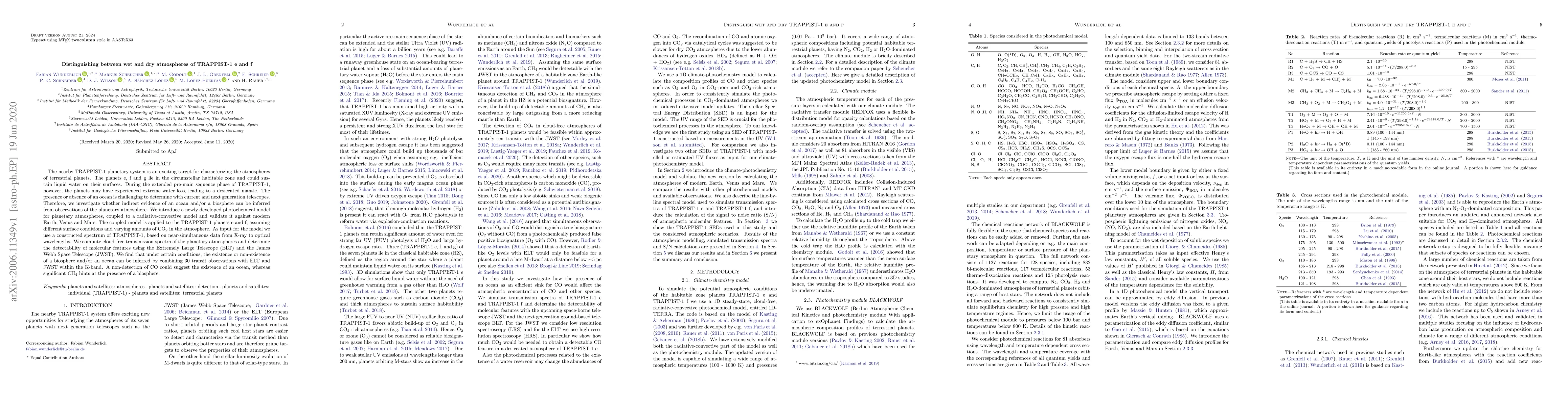 This research investigates the atmospheres of TRAPPIST-1 e and f to distinguish between wet and dry conditions, using a new photochemical model coupled with a radiative-convective model. The study finds that combining 30 transit observations with ELT and JWST can infer the presence of an ocean or biosphere, with non-detection of CO suggesting an ocean and significant CH$_4$ indicating a biosphere.