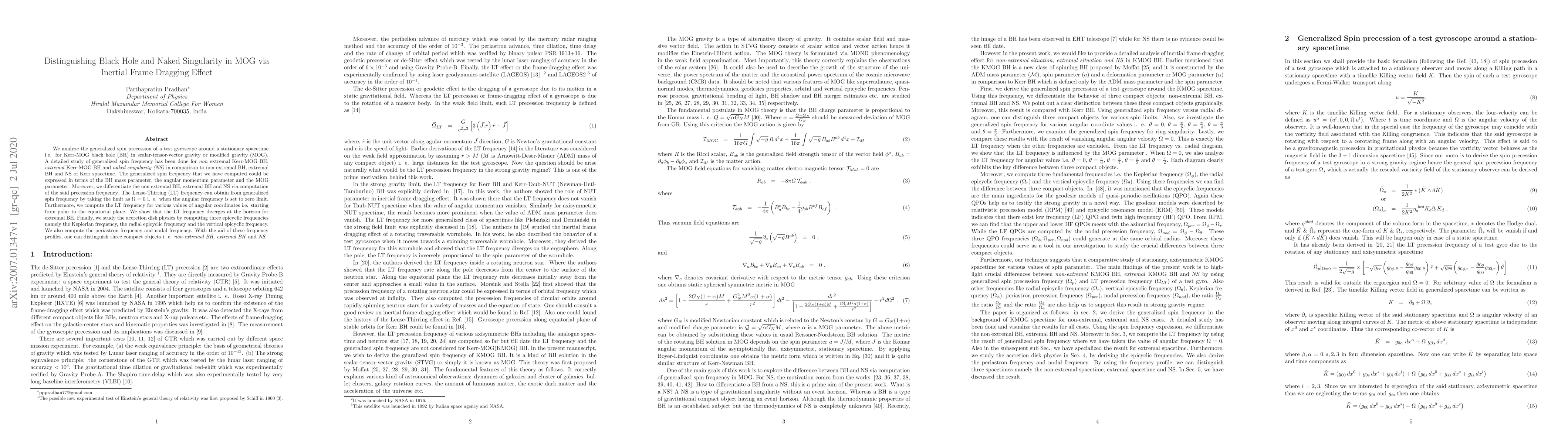 We analyze the generalized spin precession of a test gyroscope around a stationary spacetime i.e. for Kerr-MOG black hole~(BH) in scalar-tensor-vector gravity or modified gravity~(MOG). A detailed study of generalized spin frequency has been done for \emph{non} extremal Kerr-MOG BH, \emph{extremal} Kerr-MOG BH and \emph{naked singularity~(NS)} in comparison to non-extremal BH, extremal BH, and NS of Kerr spacetime. The generalized spin frequency that {we have} computed could be expressed in terms of {the} BH mass parameter, the angular momentum parameter, and the MOG parameter. Moreover, we differentiate the non-extremal BH, extremal BH, and NS via computation of the said precession frequency. The Lense-Thirring~(LT) frequency {can} obtain from generalized spin frequency by taking the limit as $\Omega=0$ i. e. {when the} angular frequency is set to zero limit. Furthermore, we compute the LT frequency for various {values of} angular coordinates i.e. starting from polar to {the} equatorial plane. We show that the LT frequency diverges at the horizon for extremal BH. Finally, we study the accretion disk physics by computing three epicyclic frequencies namely the Keplerian frequency, {the} radial epicyclic frequency and {the} vertical epicyclic frequency. We also compute the periastron frequency and nodal frequency. With the aid of these frequency profiles, {one} can distinguish three compact objects i. e. \emph{non-extremal BH, extremal BH} {and} \emph{NS}.