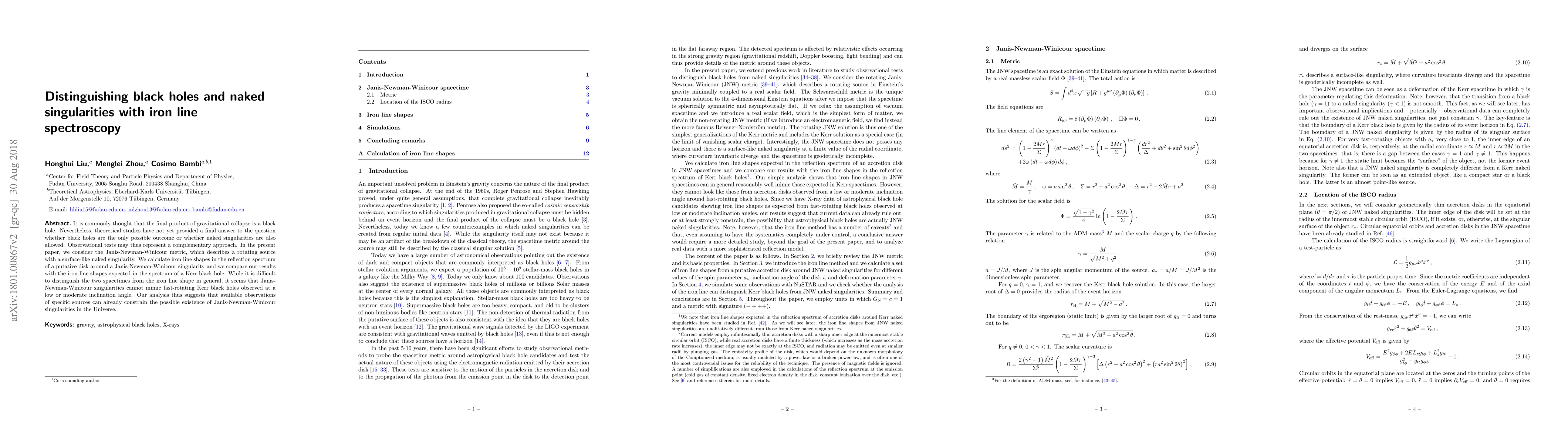 This paper investigates the possibility of distinguishing black holes from naked singularities using iron line spectroscopy. It compares iron line shapes from a rotating source with a surface-like naked singularity to those from a Kerr black hole, suggesting that specific observations may rule out the existence of certain types of naked singularities.