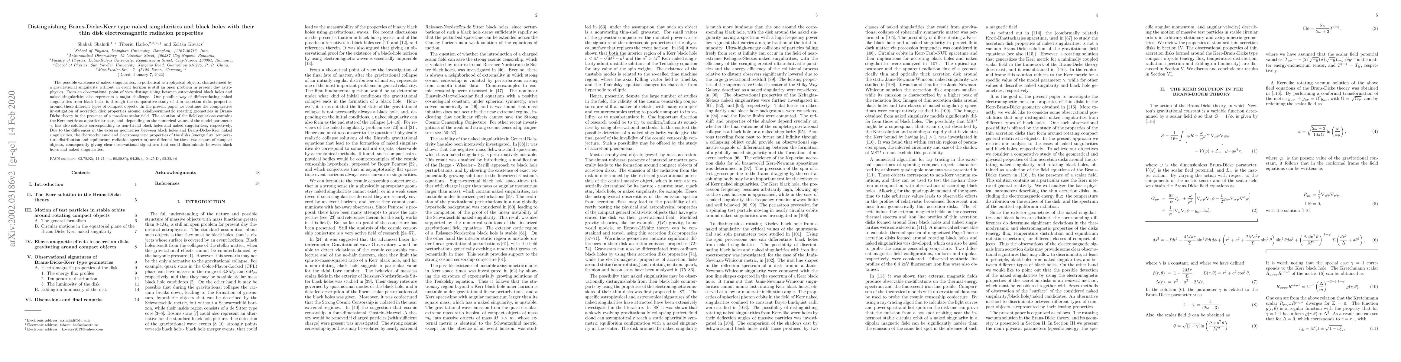 This paper explores the electromagnetic properties of thin accretion disks around Brans-Dicke-Kerr type naked singularities and black holes to distinguish between them. Differences in the thermodynamic and electromagnetic properties of the disks, such as energy flux and temperature distribution, provide distinct observational signatures that can differentiate these two types of compact objects.