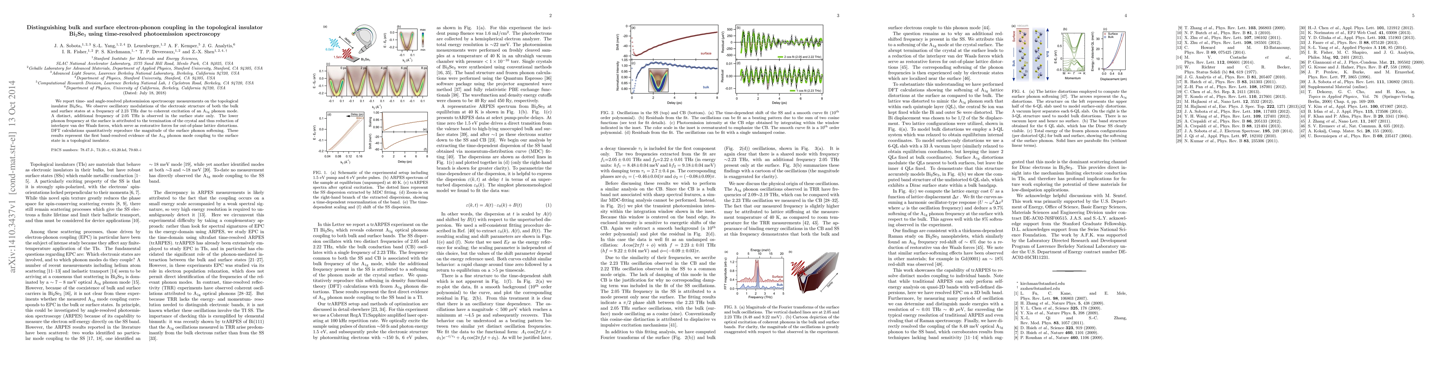 This study uses time-resolved photoemission spectroscopy to distinguish bulk and surface electron-phonon coupling in Bi2Se3, revealing oscillatory modulations at 2.23 THz for both states and an additional 2.05 THz frequency in surface states due to phonon softening. DFT calculations support these findings.
