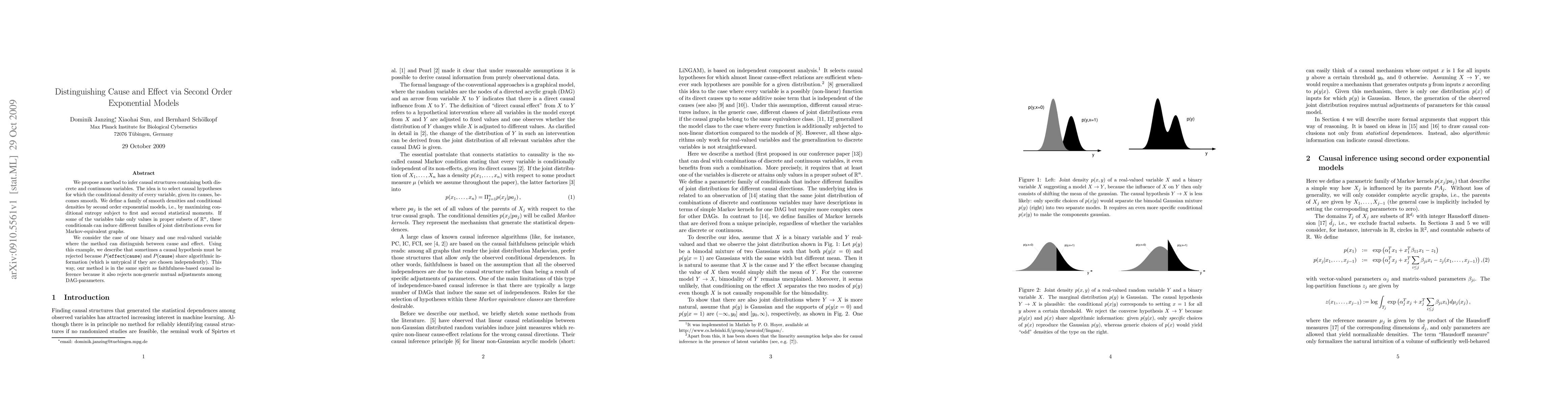 This paper proposes a method to infer causal structures using second order exponential models to maximize conditional entropy based on first and second moments, distinguishing between cause and effect in systems with both discrete and continuous variables. The method can reject non-generic mutual adjustments, aligning with faithfulness-based causal inference.