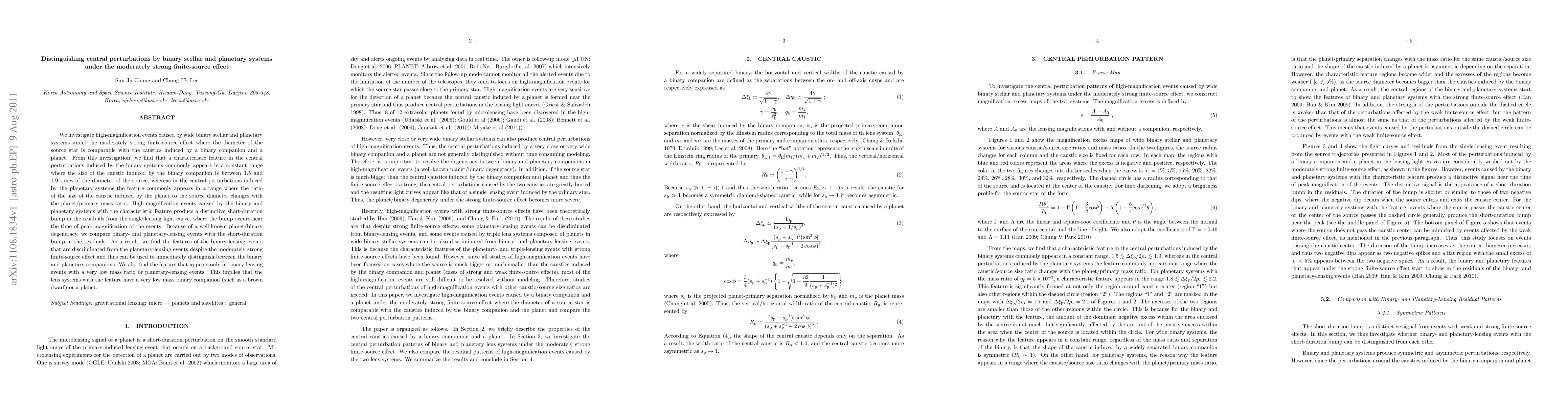 We investigate high-magnification events caused by wide binary stellar and planetary systems under the moderately strong finite-source effect where the diameter of the source star is comparable with the caustics induced by a binary companion and a planet. From this investigation, we find that a characteristic feature in the central perturbations induced by the binary systems commonly appears in a constant range where the size of the caustic induced by the binary companion is between 1.5 and 1.9 times of the diameter of the source, whereas in the central perturbations induced by the planetary systems the feature commonly appears in a range where the ratio of the size of the caustic induced by the planet to the source diameter changes with the planet/primary mass ratio. High-magnification events caused by the binary and planetary systems with the characteristic feature produce a distinctive short-duration bump in the residuals from the single-lensing light curve, where the bump occurs near the time of peak magnification of the events. Because of a well-known planet/binary degeneracy, we compare binary- and planetary-lensing events with the short-duration bump in the residuals. As a result, we find the features of the binary-lensing events that are discriminated from the planetary-lensing events despite the moderately strong finite-source effect and thus can be used to immediately distinguish between the binary and planetary companions. We also find the feature that appears only in binary-lensing events with a very low mass ratio or planetary-lensing events. This implies that the lens systems with the feature have a very low mass binary companion (such as a brown dwarf) or a planet.