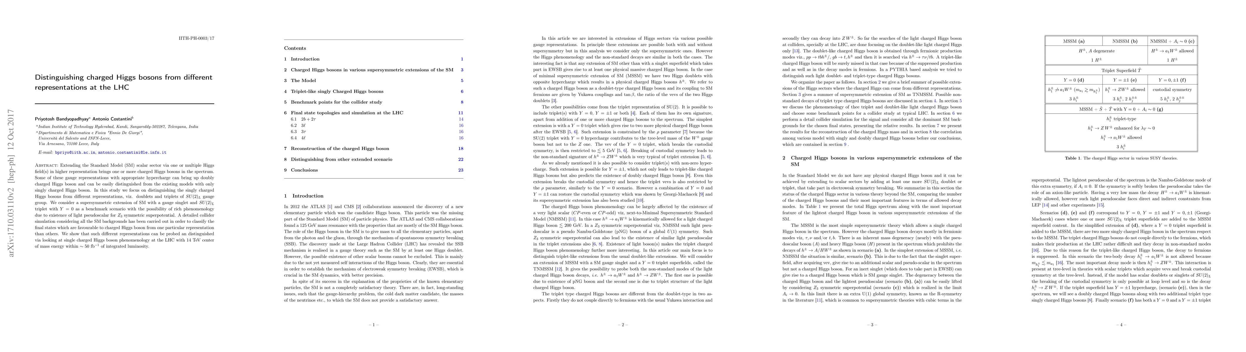 Extending the Standard Model (SM) scalar sector via one or multiple Higgs field(s) in higher representation brings one or more charged Higgs bosons in the spectrum. Some of these gauge representations with appropriate hypercharge can bring up doubly charged Higgs boson and can be easily distinguished from the existing models with only singly charged Higgs boson. In this study we focus on distinguishing the singly charged Higgs bosons from different representations, viz. doublets and triplets of $SU(2)_L$ gauge group. We consider a supersymmetric extension of SM with a gauge singlet and $SU(2)_L$ triplet with $Y=0$ as a benchmark scenario with the possibility of rich phenomenology due to existence of light pseudoscalar for $Z_3$ symmetric superpotential. A detailed collider simulation considering all the SM backgrounds has been carried out in order to classify the final states which are favourable to charged Higgs boson from one particular representation than others. We show that such different representations can be probed an distinguished via looking at single charged Higgs boson phenomenology at the LHC with 14 TeV center of mass energy within $\sim 50$ fb$^{-1}$ of integrated luminosity.