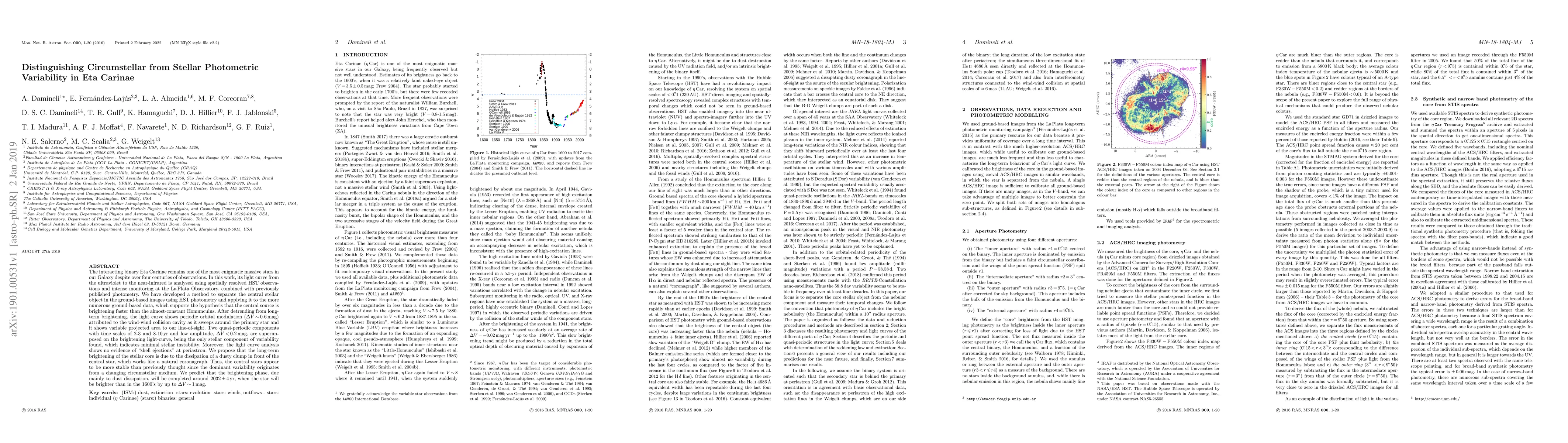 The interacting binary Eta Carinae remains one of the most enigmatic massive stars in our Galaxy despite over four centuries of observations. In this work, its light curve from the ultraviolet to the near-infrared is analysed using spatially resolved HST observations and intense monitoring at the La Plata Observatory, combined with previously published photometry. We have developed a method to separate the central stellar object in the ground-based images using HST photometry and applying it to the more numerous ground-based data, which supports the hypothesis that the central source is brightening faster than the almost-constant Homunculus. After detrending from long-term brightening, the light curve shows periodic orbital modulation ($\Delta V$ $\sim$ 0.6 mag) attributed to the wind-wind collision cavity as it sweeps around the primary star and it shows variable projected area to our line-of-sight. Two quasi-periodic components with time scales of 2-3 and 8-10 yr and low amplitude, $\Delta V$ $<$ 0.2 mag, are superimposed on the brightening light-curve, being the only stellar component of variability found, which indicates minimal stellar instability. Moreover, the light curve analysis shows no evidence of `shell ejections' at periastron. We propose that the long-term brightening of the stellar core is due to the dissipation of a dusty clump in front of the central star, which works like a natural coronagraph. Thus, the central stars appear to be more stable than previously thought since the dominant variability originates from a changing circumstellar medium. We predict that the brightening phase, due mainly to dust dissipation, will be completed around 2032 $\pm$ 4 yr, when the star will be brighter than in the 1600's by up to $\Delta V$ $\sim$ 1 mag.