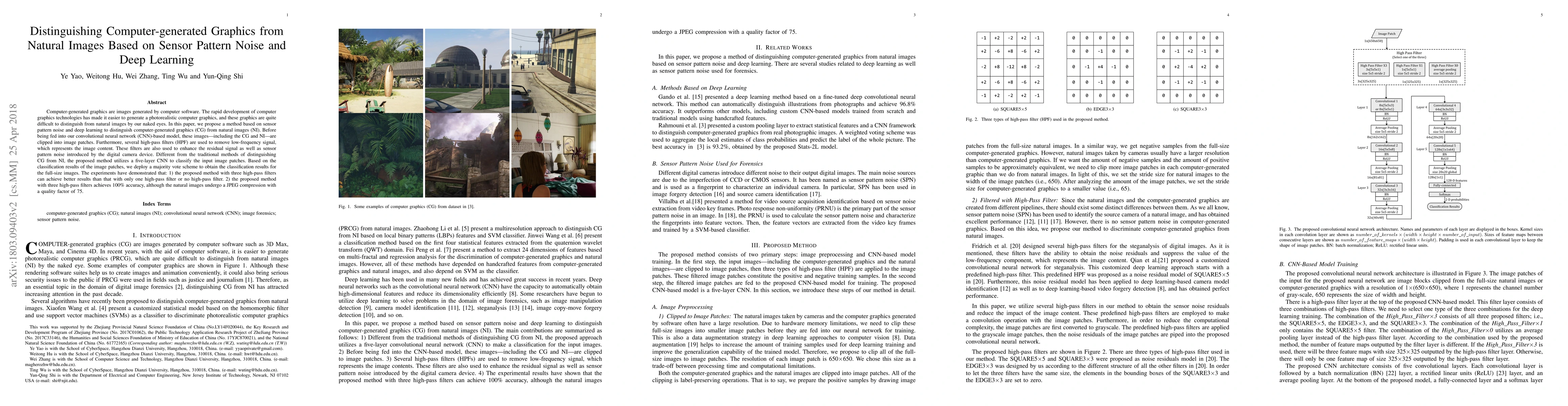 Computer-generated graphics (CGs) are images generated by computer software. The~rapid development of computer graphics technologies has made it easier to generate photorealistic computer graphics, and these graphics are quite difficult to distinguish from natural images (NIs) with the naked eye. In this paper, we propose a method based on sensor pattern noise (SPN) and deep learning to distinguish CGs from NIs. Before being fed into our convolutional neural network (CNN)-based model, these images---CGs and NIs---are clipped into image patches. Furthermore, three high-pass filters (HPFs) are used to remove low-frequency signals, which represent the image content. These filters are also used to reveal the residual signal as well as SPN introduced by the digital camera device. Different from the traditional methods of distinguishing CGs from NIs, the proposed method utilizes a five-layer CNN to classify the input image patches. Based on the classification results of the image patches, we deploy a majority vote scheme to obtain the classification results for the full-size images. The~experiments have demonstrated that (1) the proposed method with three HPFs can achieve better results than that with only one HPF or no HPF and that (2) the proposed method with three HPFs achieves 100\% accuracy, although the NIs undergo a JPEG compression with a quality factor of 75.
