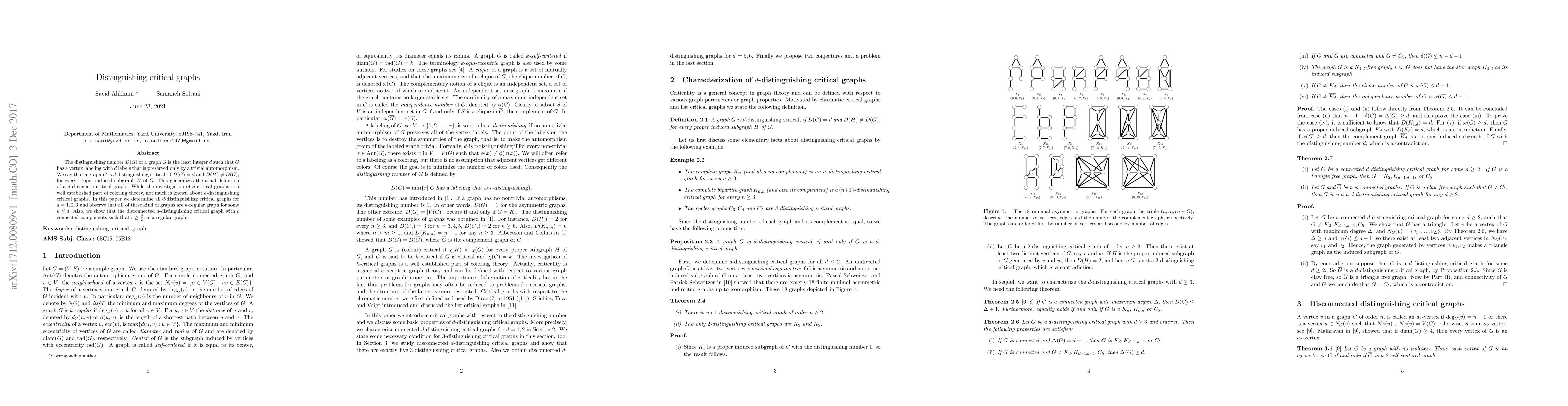 This paper identifies all $d$-distinguishing critical graphs for $d=1,2,3$, revealing that they are $k$-regular graphs for some $k\leq d$. It also demonstrates that disconnected $d$-distinguishing critical graphs with $c\geq \frac{d}{2}$ connected components are regular graphs.