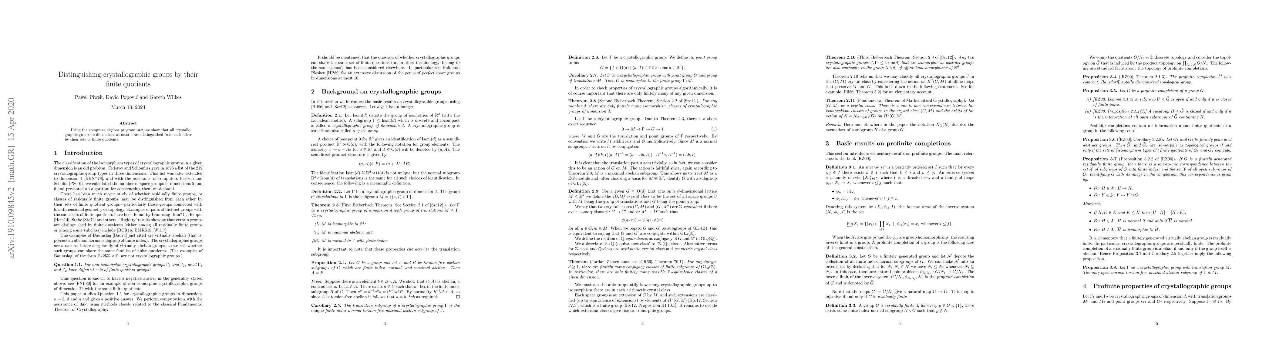 Summary: The paper demonstrates, using GAP software, that crystallographic groups in dimensions up to 4 can be uniquely identified based on their sets of finite quotients. This method provides a reliable way to distinguish between different crystallographic groups.